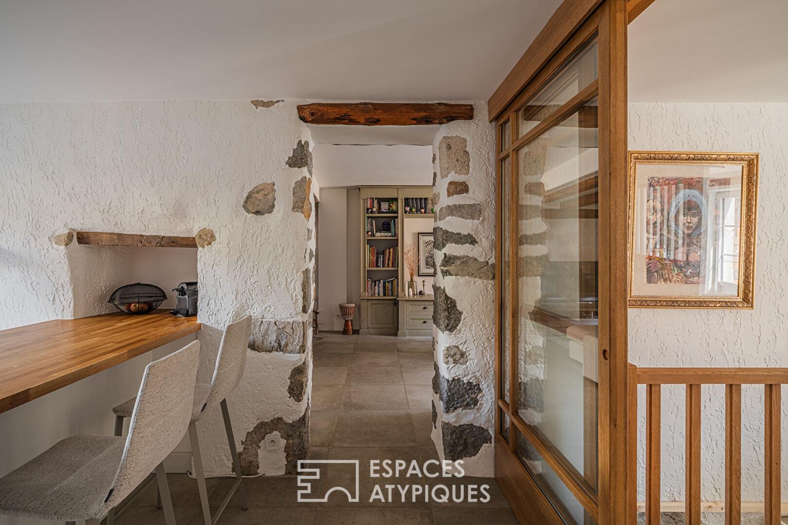 Dès l’entrée, le rez-de-chaussée dévoile des éléments d’origine préservés, à l’image d’un banc en pierre témoignant de l’histoire du lieu.