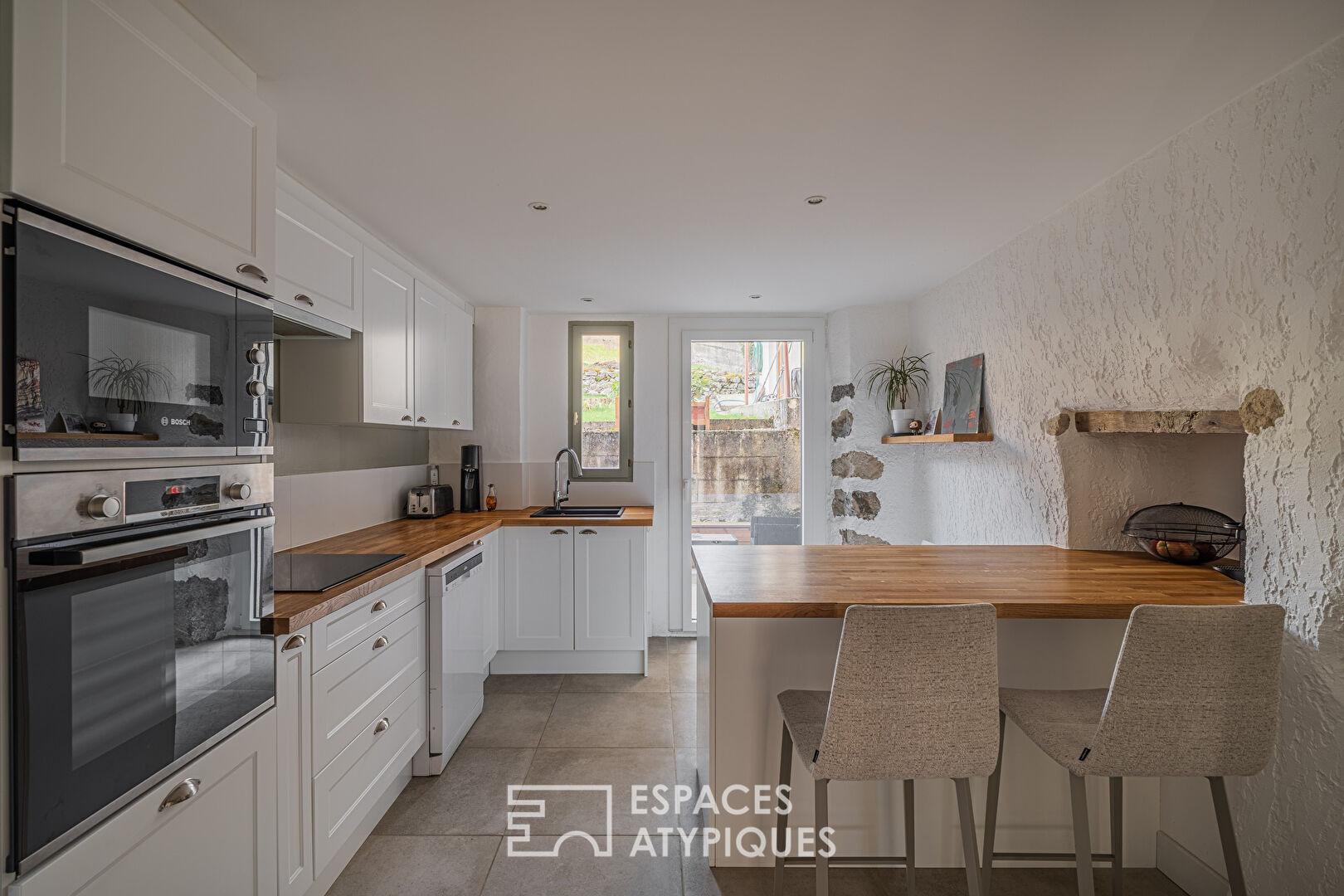 Ce niveau distribue une cuisine entièrement rénovée, ouverte sur une petite terrasse intimiste, ainsi qu’un séjour avec accès direct au jardin, offrant une atmosphère feutrée et propice à la détente.
