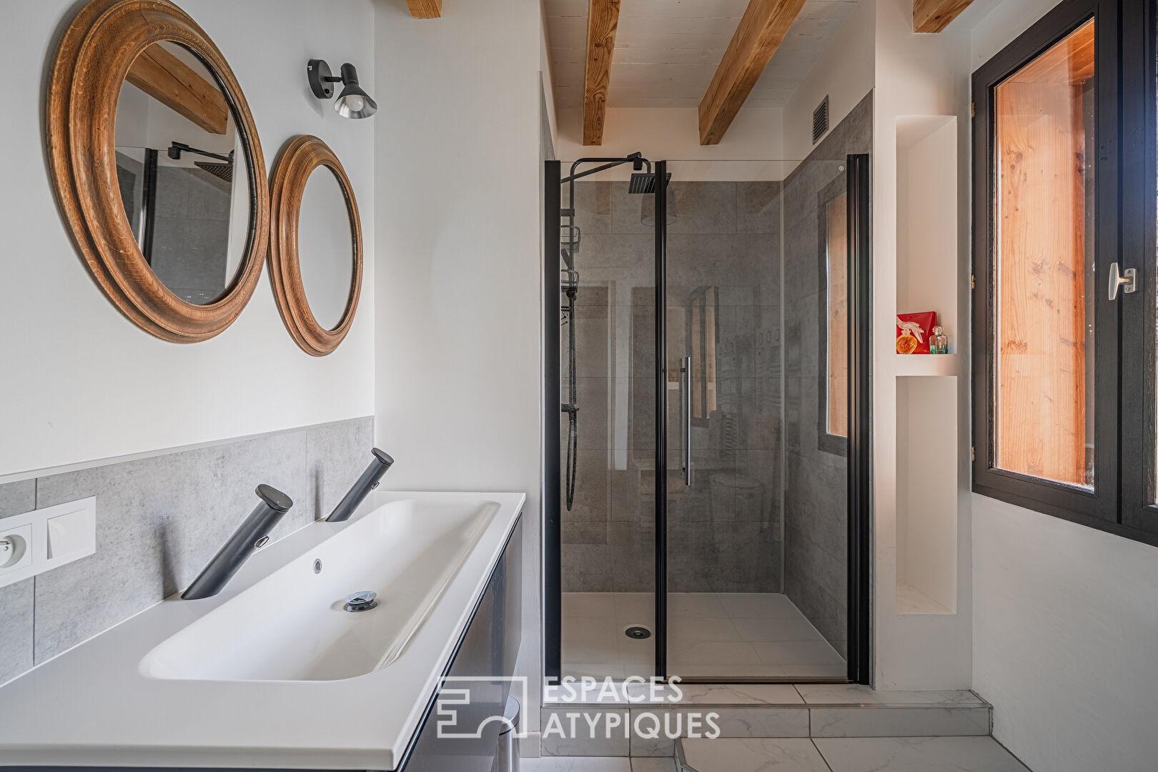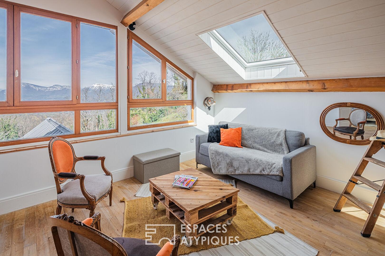 Le dernier niveau, véritable signature du bien, abrite un atelier d’artiste baigné de lumière naturelle grâce à un puits de lumière et une large fenêtre offrant une vue magnifique sur les montagnes. Deux pièces complémentaires permettent d’imaginer un bureau, un espace de télétravail ou des chambres d’appoint selon les besoins.