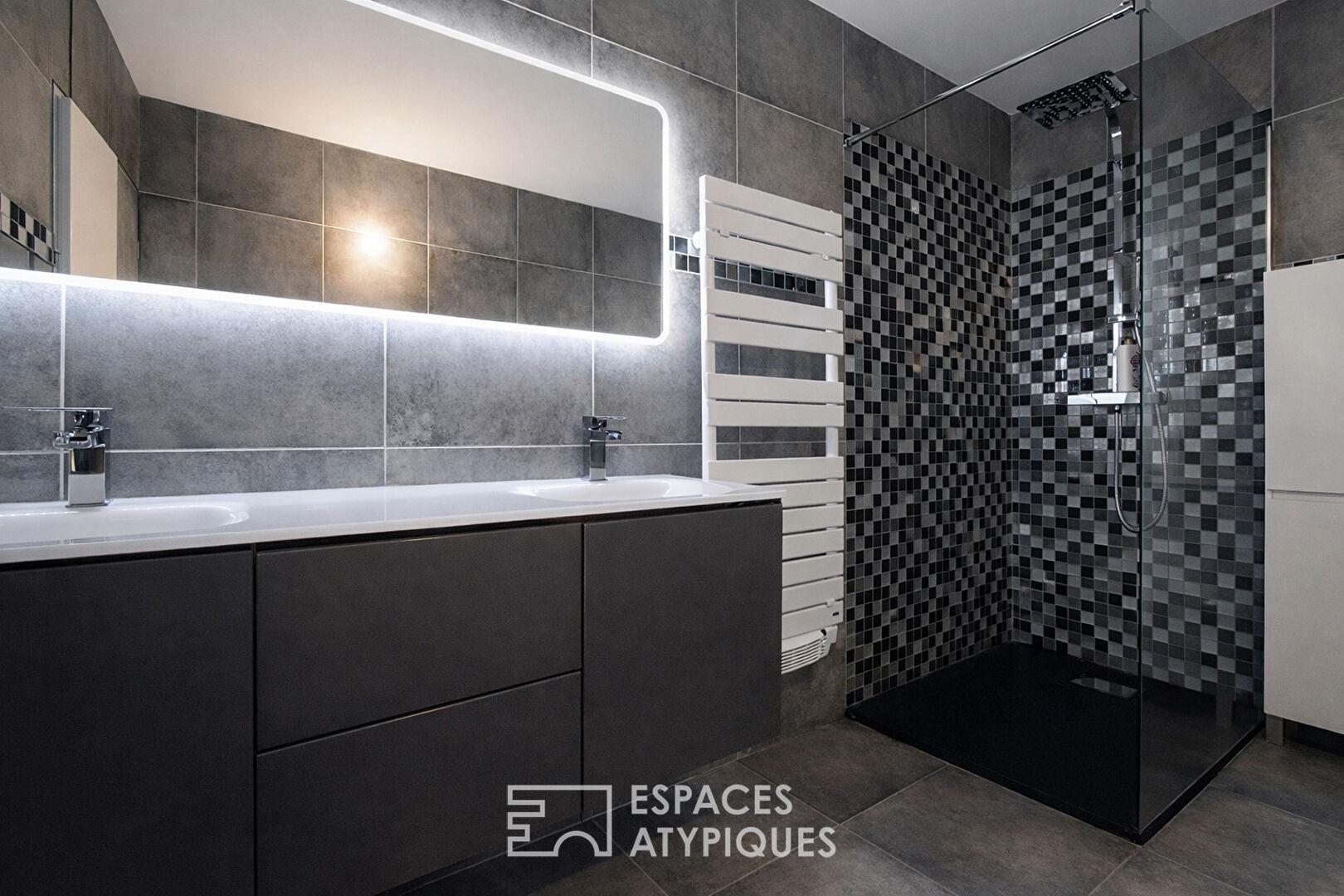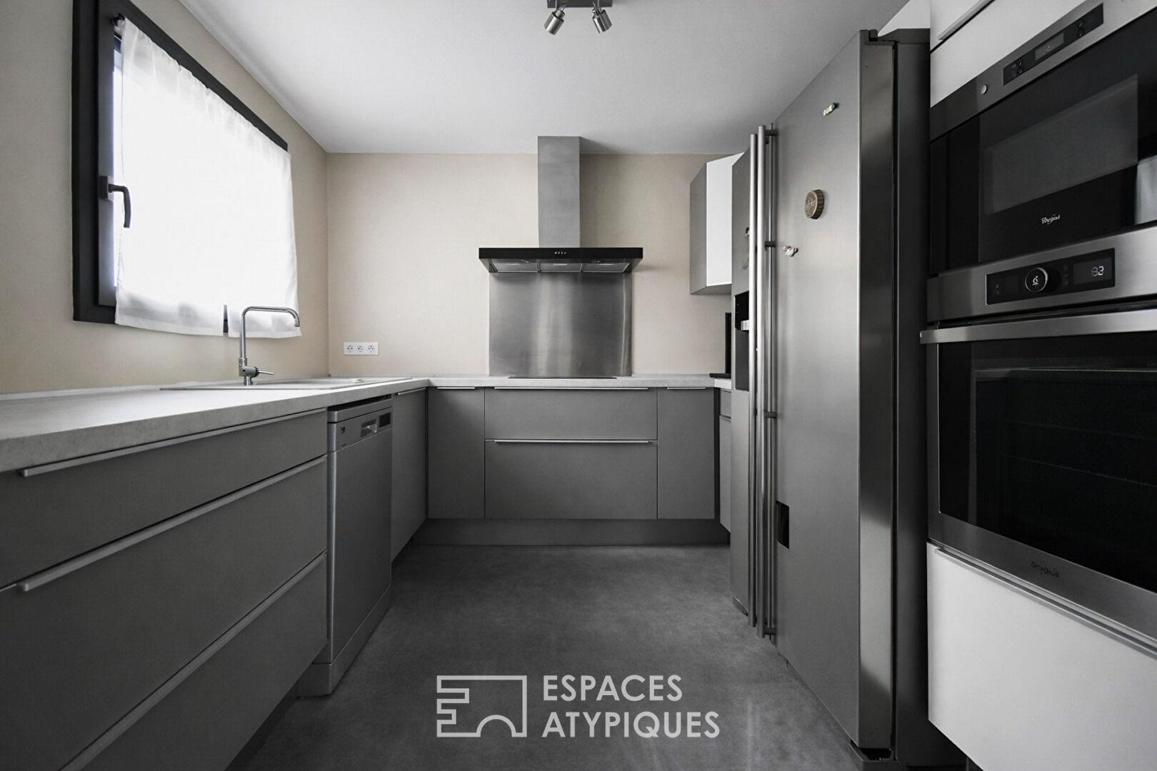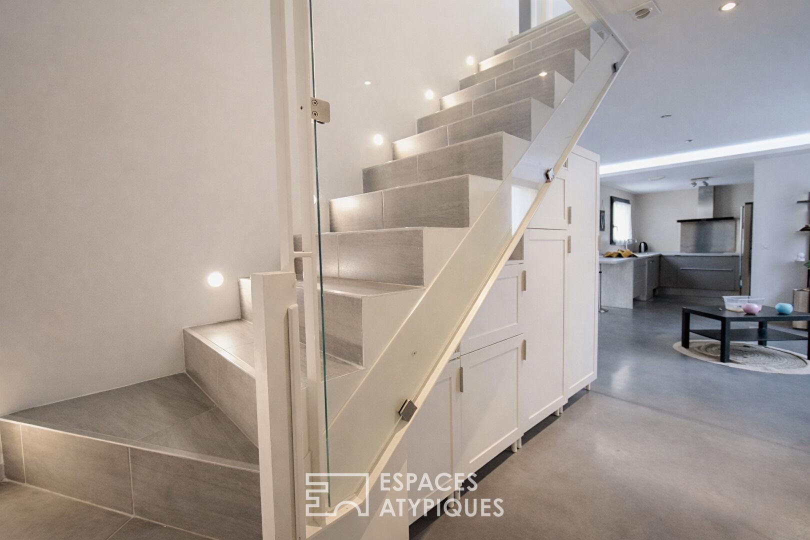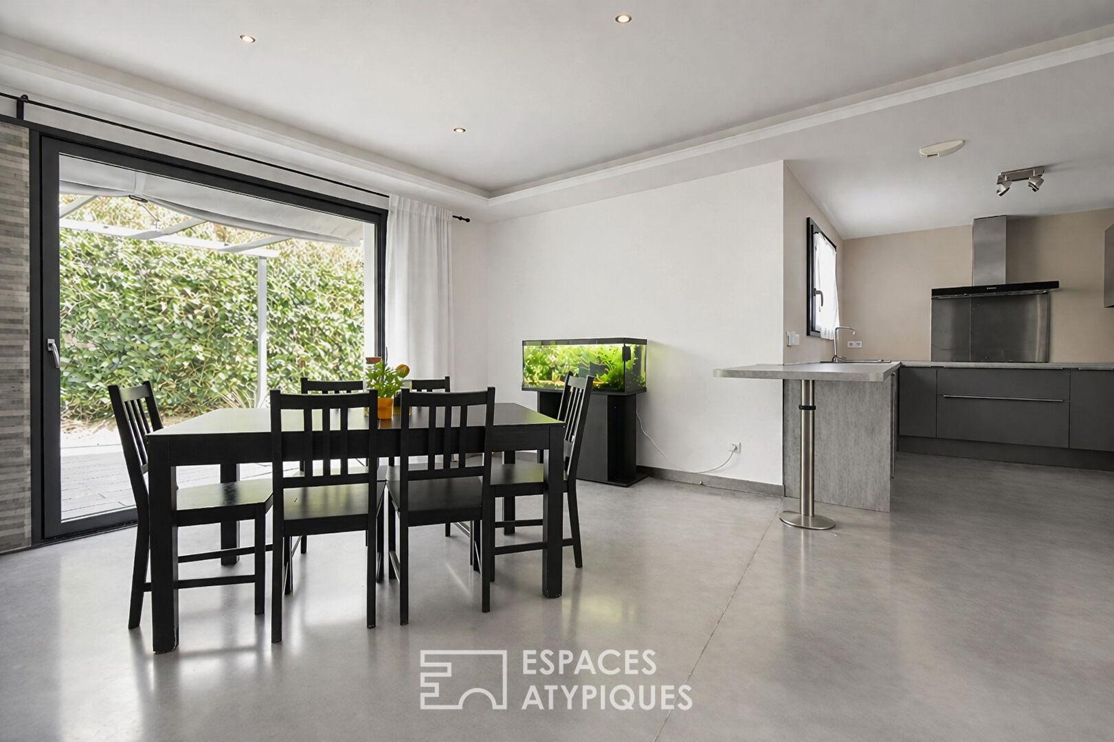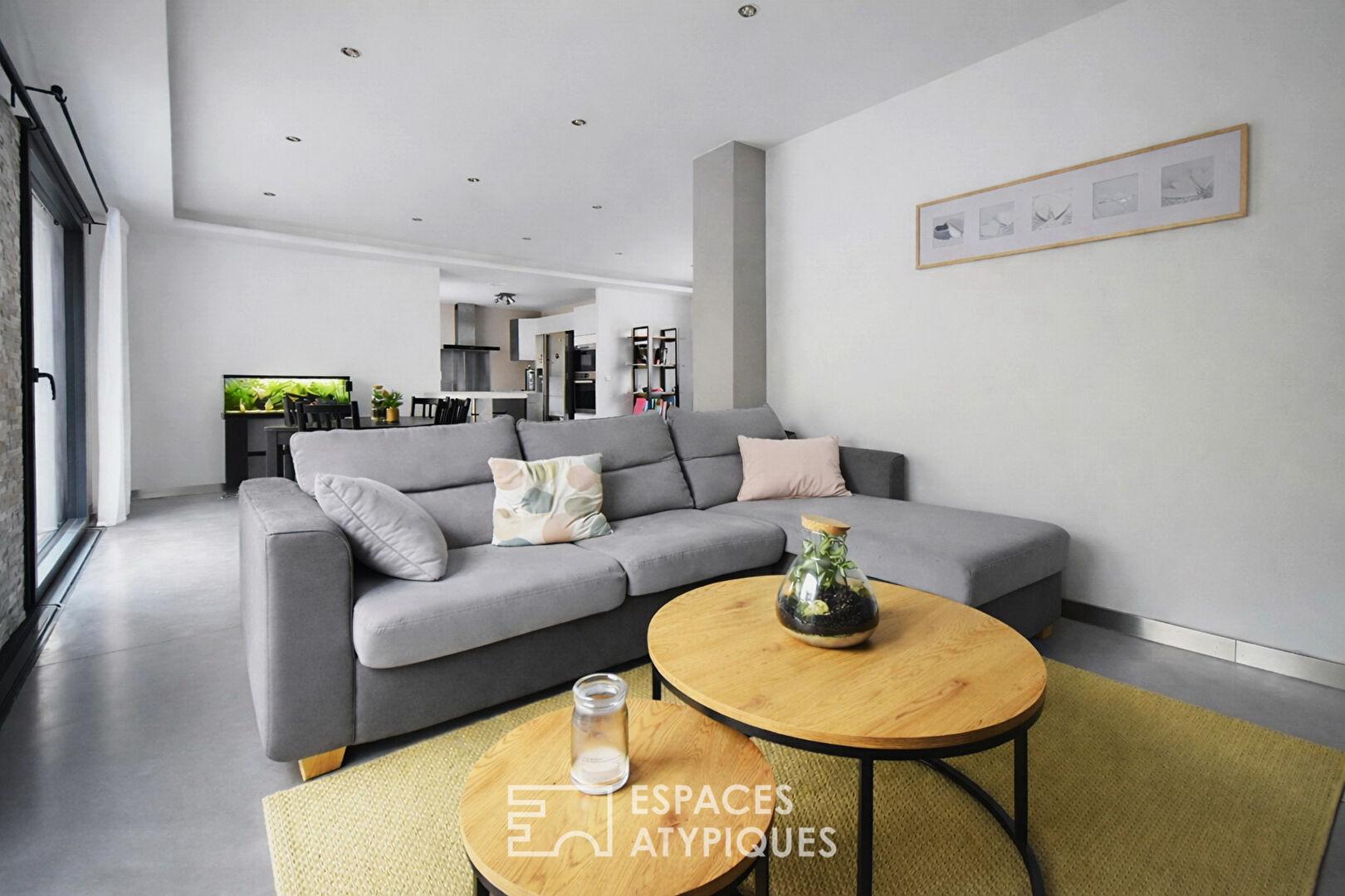 L’entrée révèle une vaste pièce de vie lumineuse où les frontières s’effacent entre la cuisine ouverte, le salon et l’espace dînatoire. Ce volume traversant, aux lignes épurées et au sol en béton ciré dégage une atmosphère apaisante et résolument actuelle. Un WC indépendant complète ce niveau.