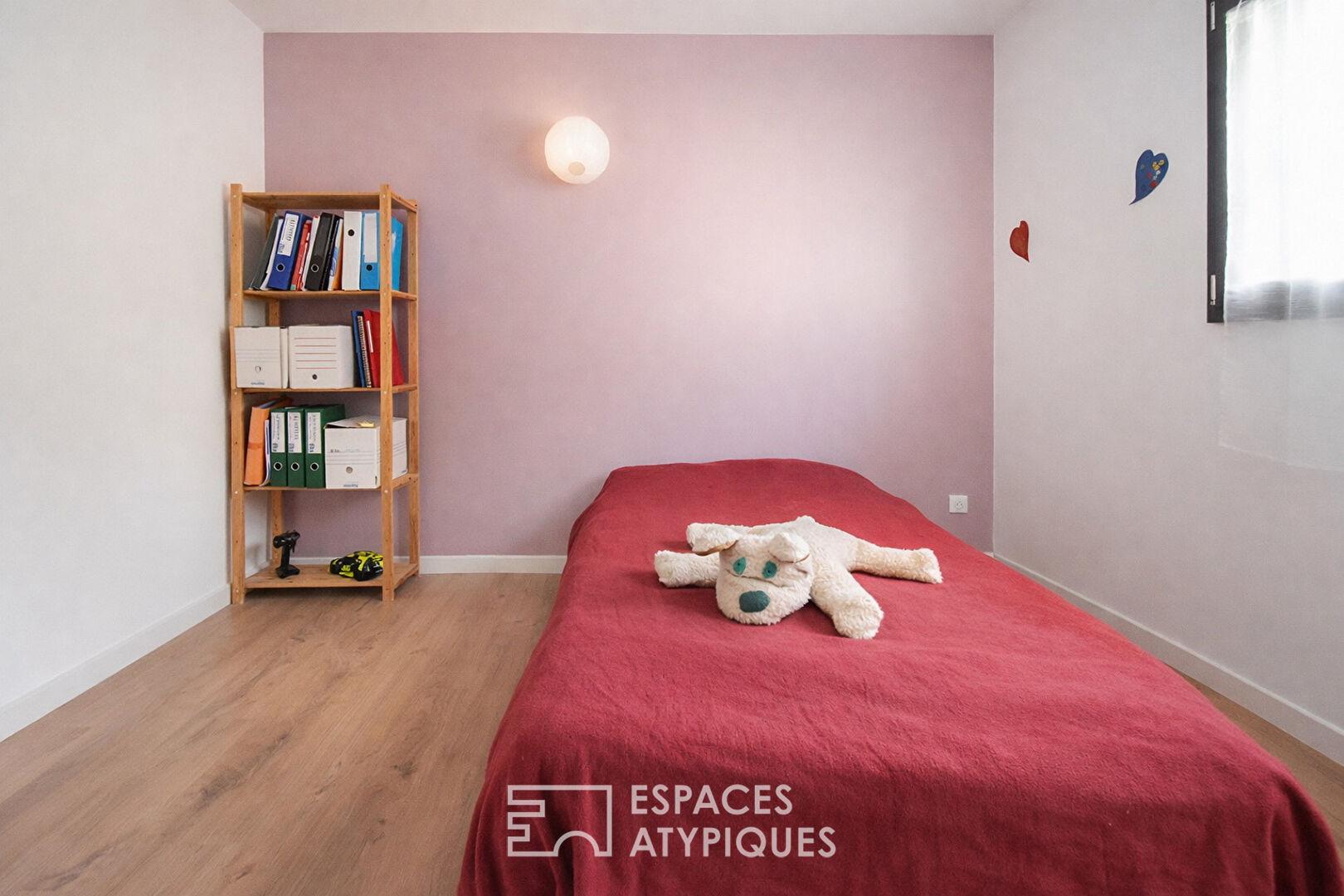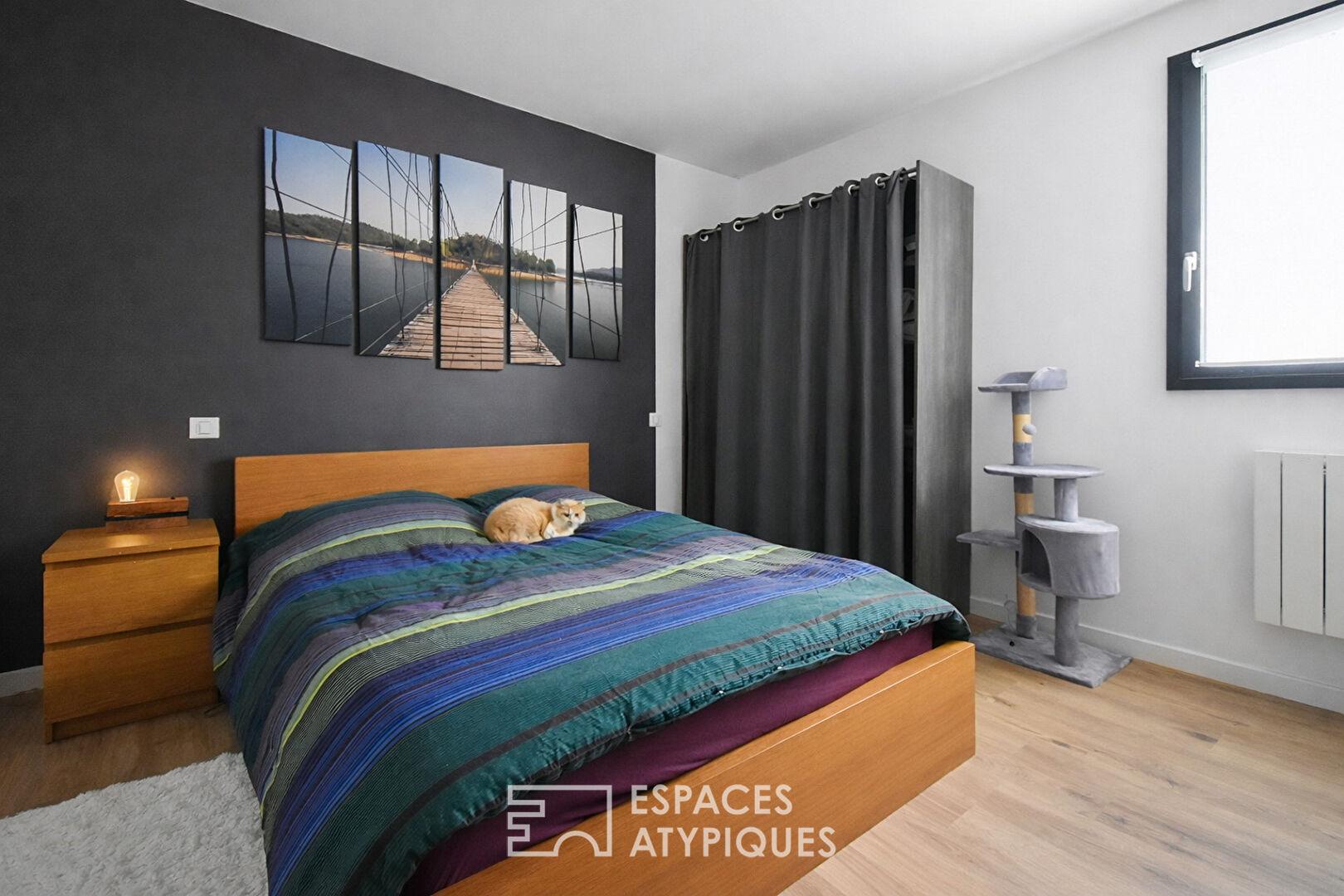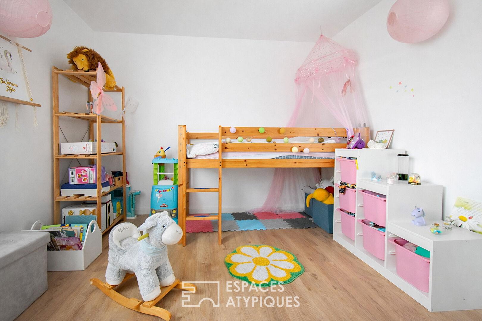 L’escalier mène à l’espace nuit composé de trois chambres confortables. Une salle de bain complète, dotée d’une douche et d’une baignoire, ainsi qu’un second WC, occupe cet étage dédié à l’intimité familiale. Les annexes, comprenant un garage, une pièce technique et une buanderie, apportent une fonctionnalité maximale à ce bien atypique.