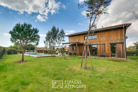 La maison bénéficie d’équipements écologiques: borne de recharge VE, bardage en pin des Landes, design héliothermique (lucarne soleil d’hiver, façade Nord pleine), peintures sans COV, béton de chanvre, ventilation double flux, chauffe-eau thermodynamique, climatisation, poêle à bois, panneaux PV, forage eau, filtres eau froide, arrosage automatique, paillage et fauchage raisonné, piscine sécurisée à filtration au sel automatique.