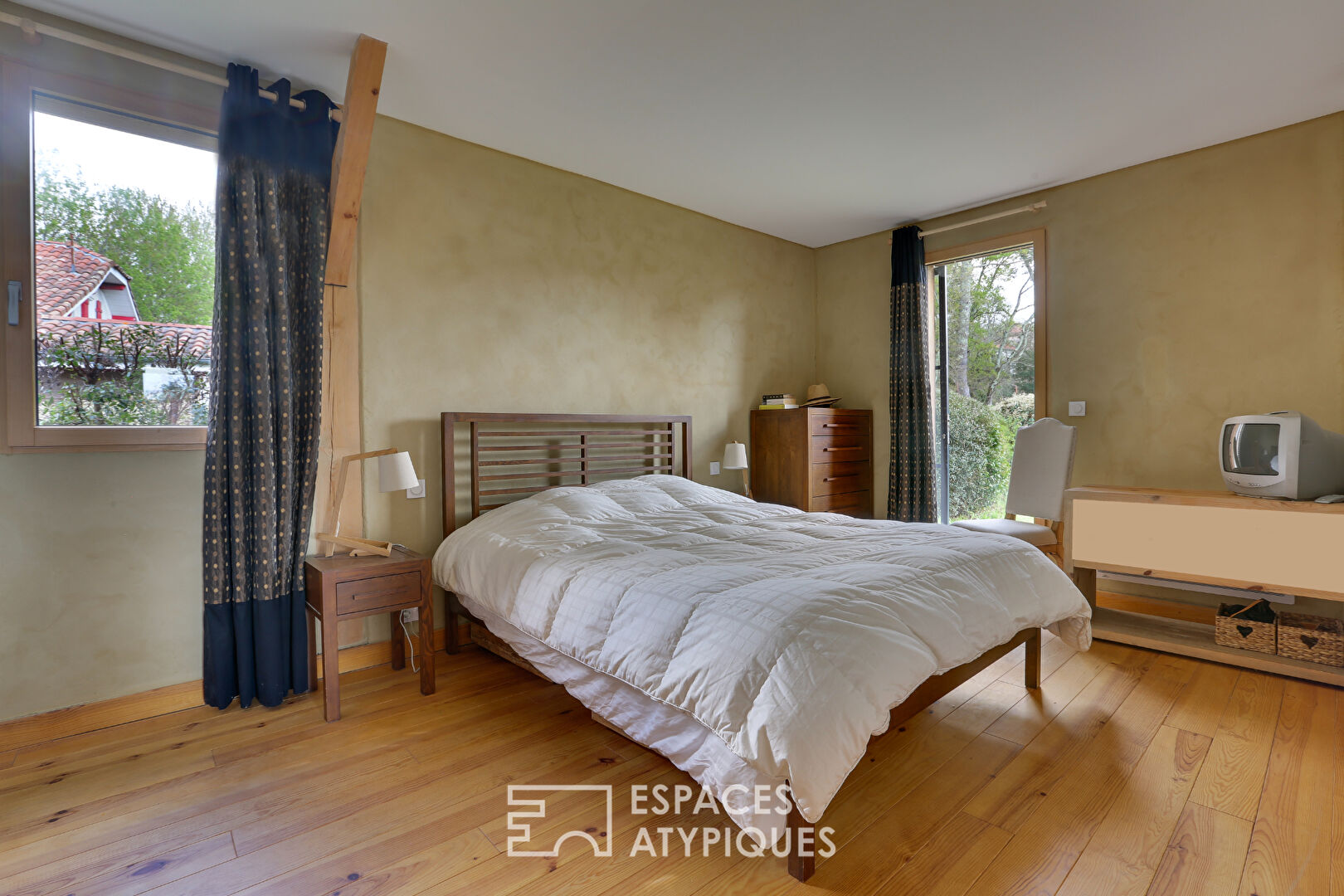 La confortable suite parentale dispose d’une salle de douche et d’un accès direct sur le jardin.