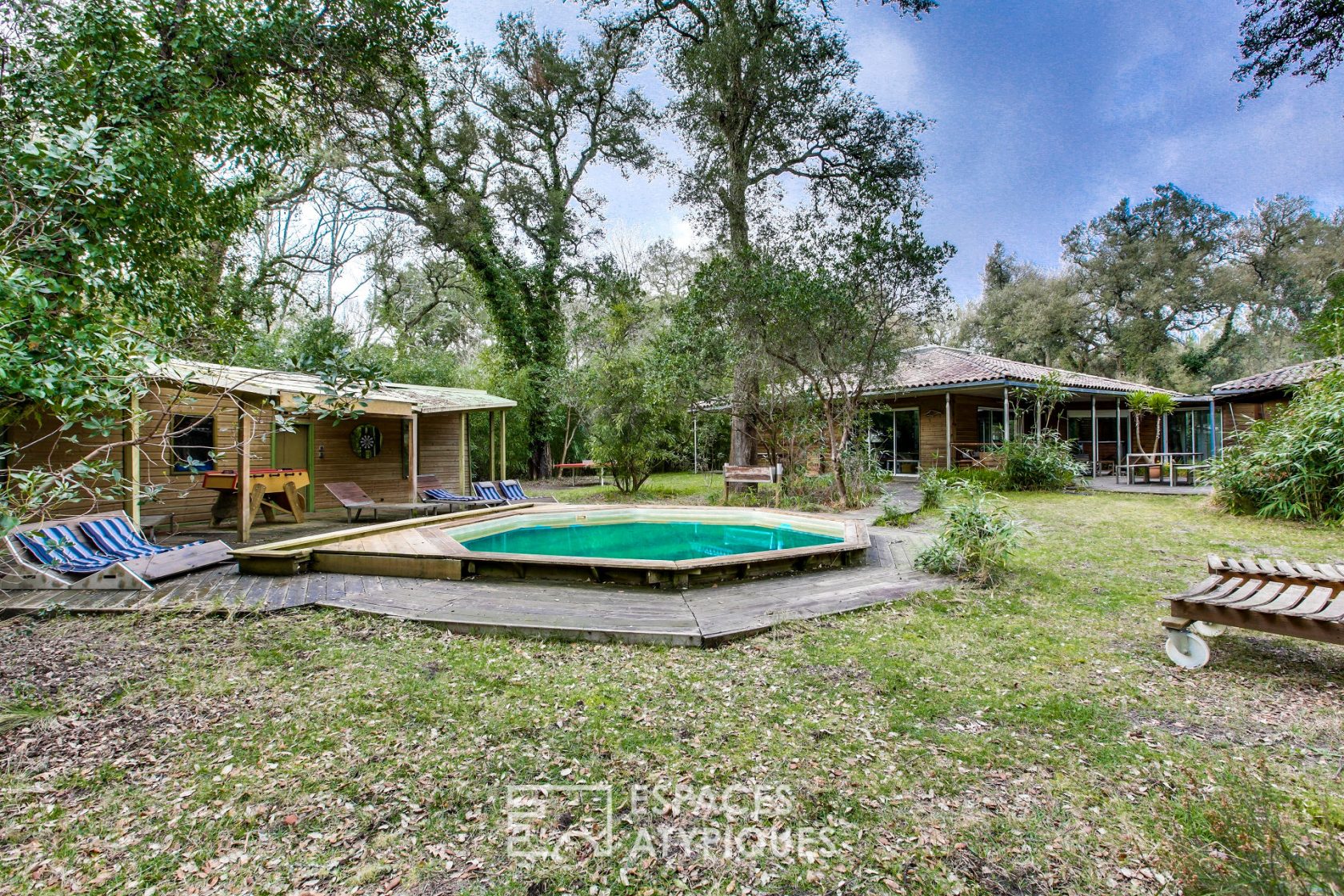 Situé à Linxe, à 15 min des plages, dans un environnement plat, dépaysant, digne d’un Robinson du XXIème siècle, cet airial de plus de 5000 m² propose une maison principale avec piscine, pool house et dépendance. La nature environnante, la végétation et la quarantaine de chênes liège, jeunes de plus de 2 siècles chacun, encouragent au bien être et au repos en profitant de la quiétude des lieux.