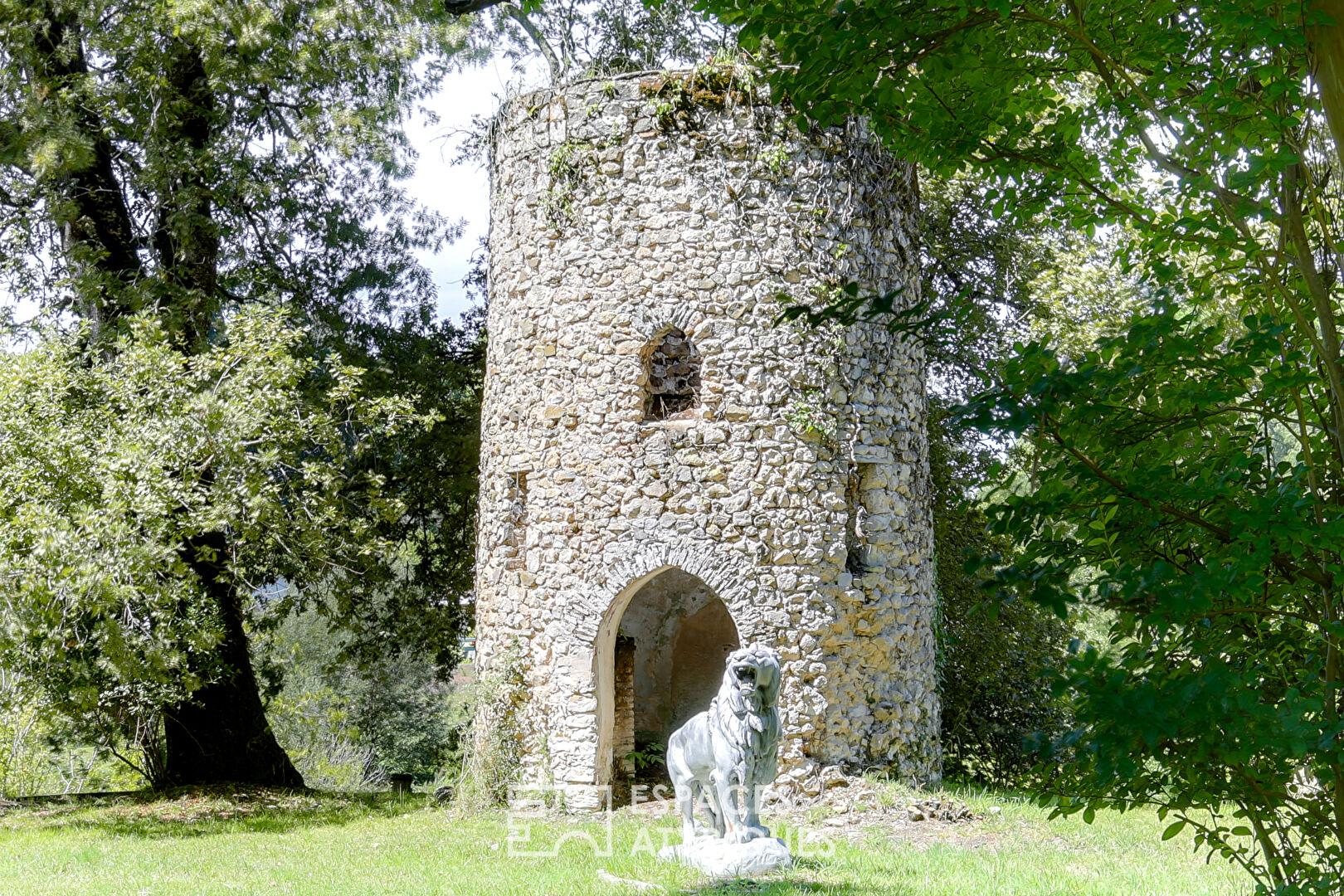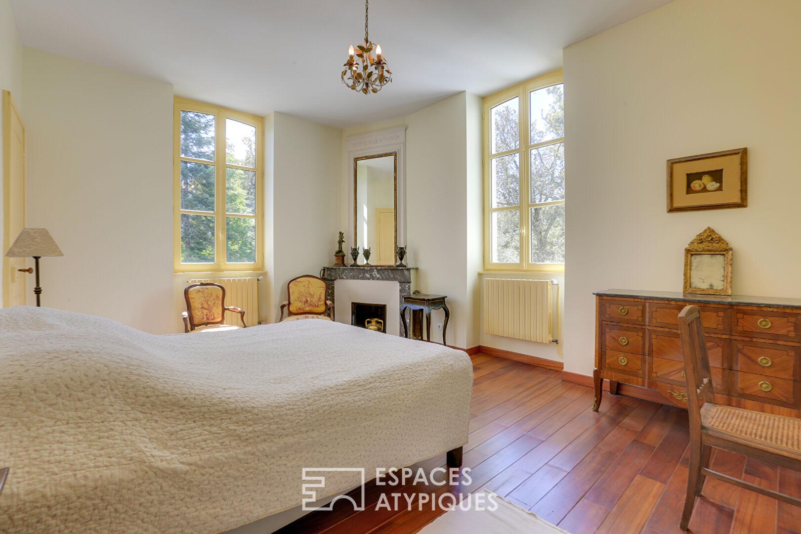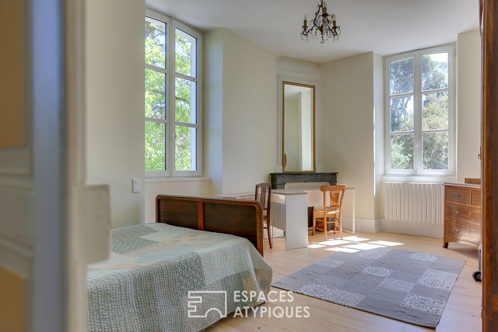 À l’extérieur, le parc dévoile une grande variété d’essences, ponctué par une chêneraie et un ancien château d’eau en pierre d’antan.