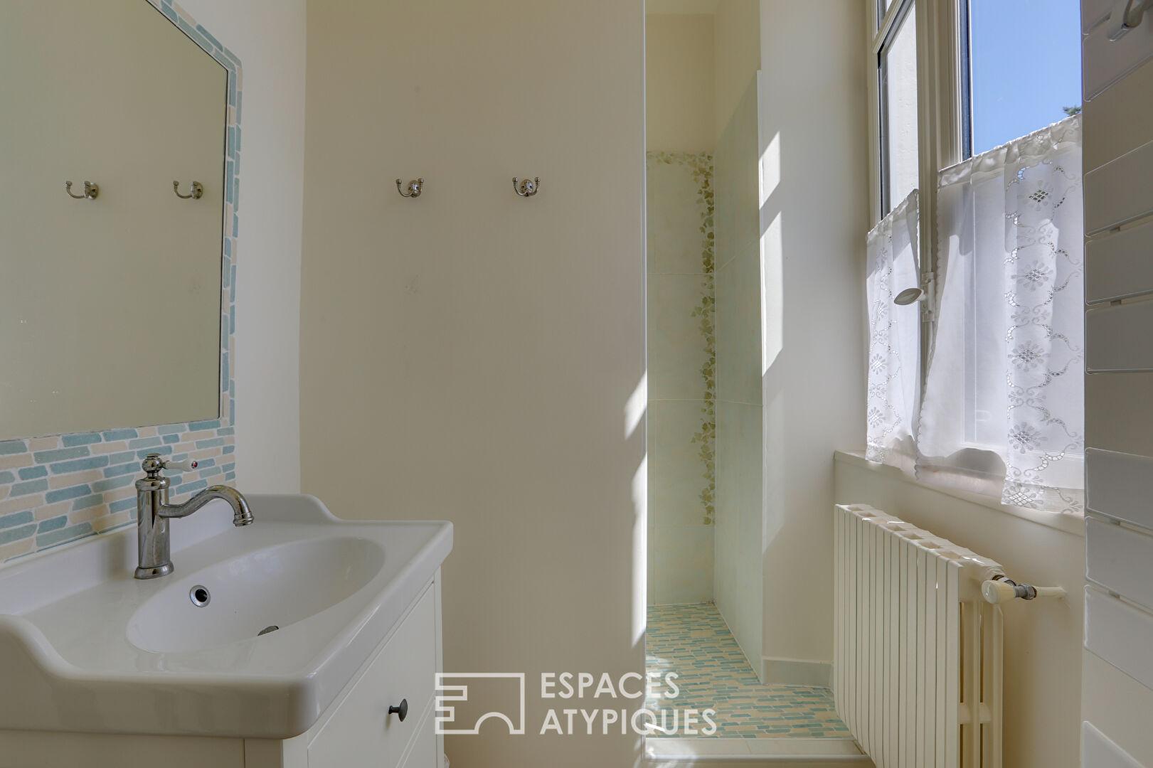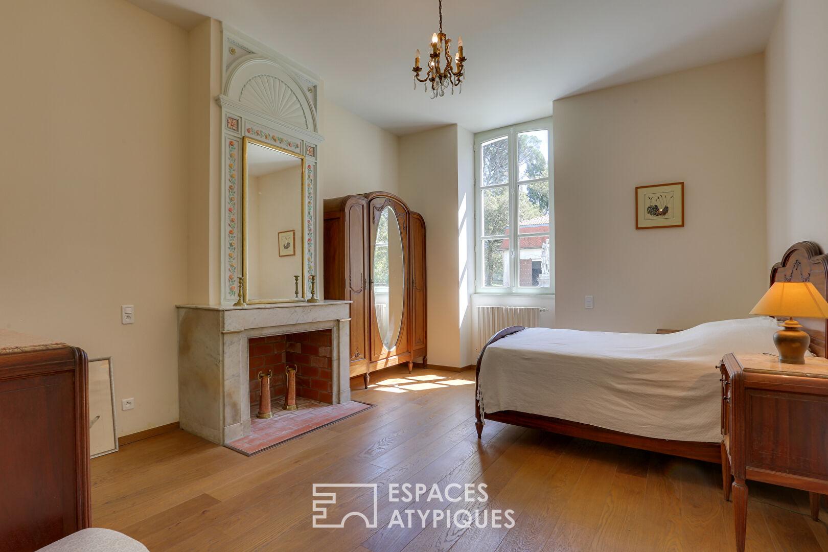 Le rez-de-chaussée accueille de vastes pièces de réception baignées de lumière, où cheminées anciennes, boiseries d’époque et carreaux de ciment créent une atmosphère raffinée. La cuisine familiale complète cet espace de vie convivial.