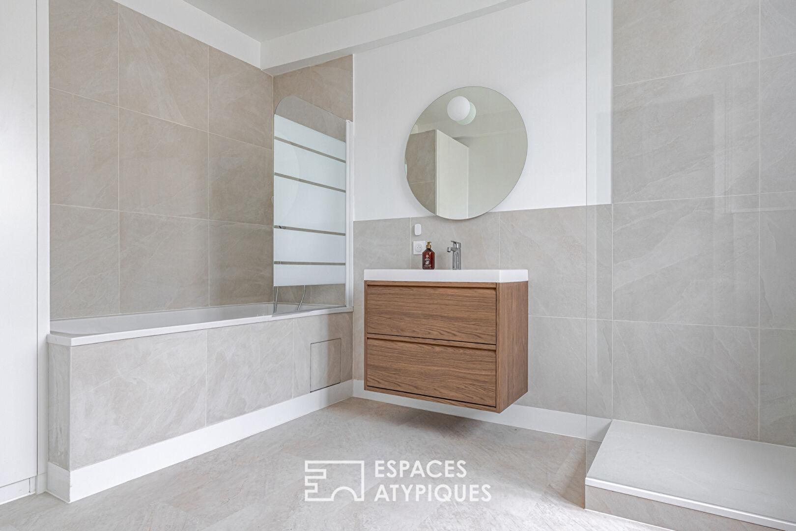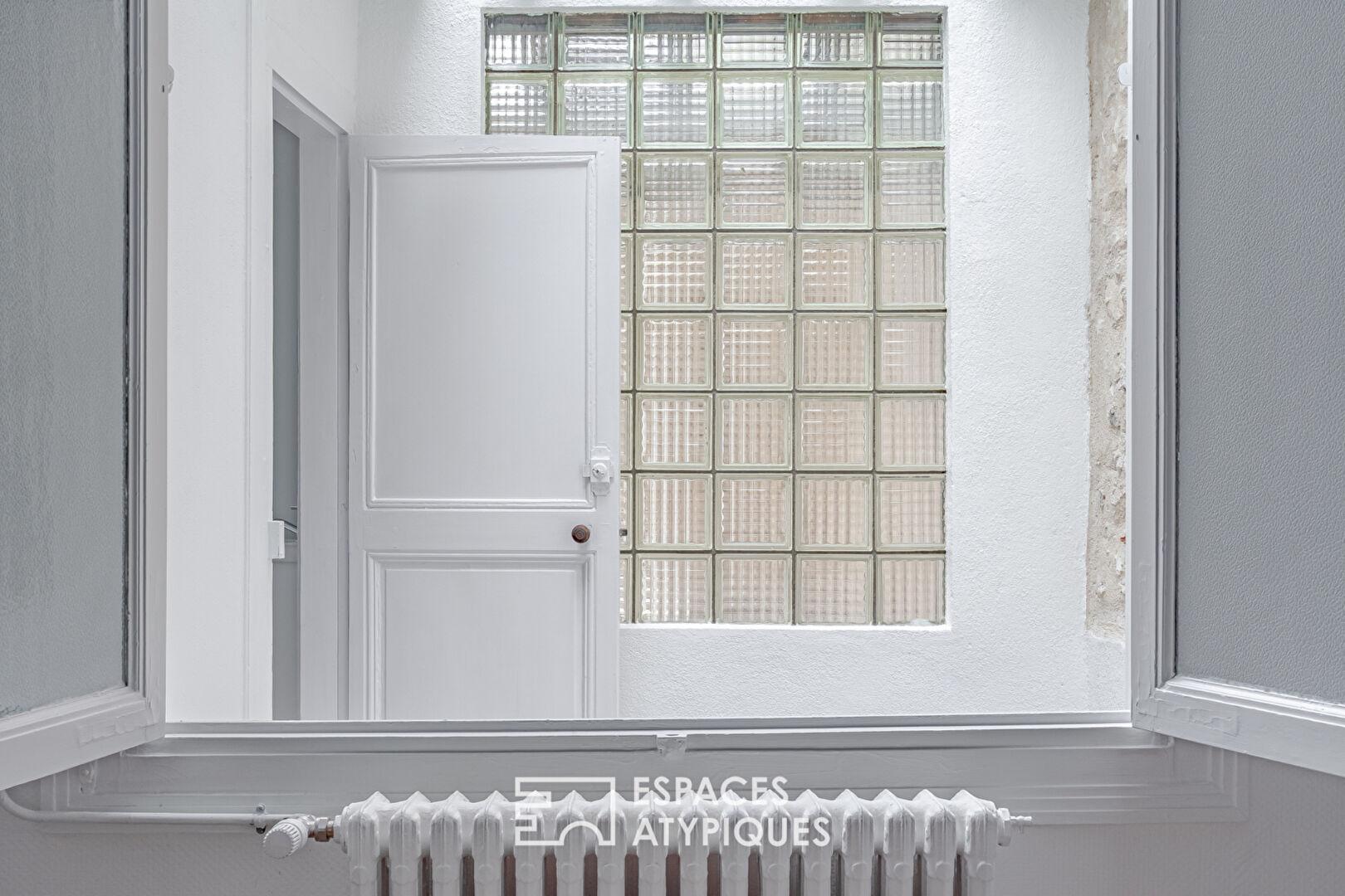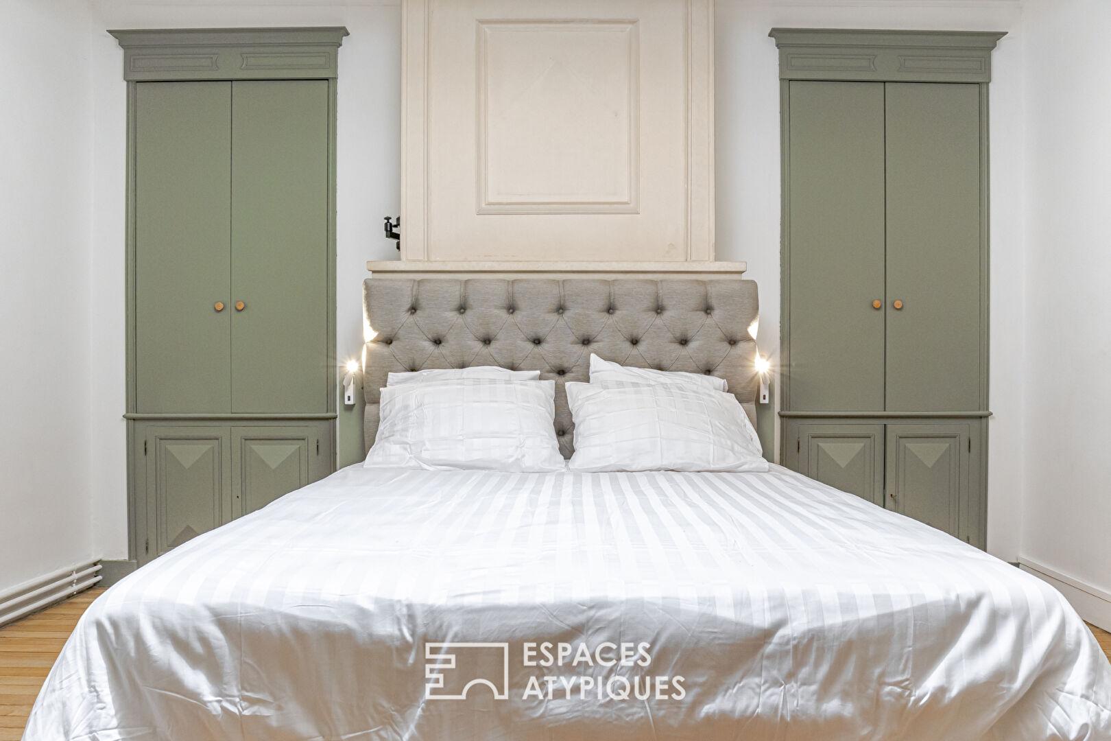 L’entrée s’ouvre sur un vaste dégagement aménagé de rangements toute hauteur, pensé comme une véritable pièce intermédiaire aux usages multiples. Dès les premiers pas, les volumes s’imposent avec justesse. Le salon, chaleureux et raffiné, s’articule autour d’une cheminée ancienne et d’une bibliothèque sur mesure, dans une atmosphère à la fois feutrée et lumineuse. Dans son prolongement, la cuisine, aménagée et équipée, s’inscrit dans une esthétique actuelle aux lignes sobres. Les parquets et la belle hauteur sous plafond renforcent l’authenticité des lieux. L’espace nuit accueille trois chambres, dont une suite parentale avec salle d’eau privative. Une seconde salle d’eau complète l’ensemble. En retrait, une pièce supplémentaire, éclairée par un puits de lumière, compose un espace à s’approprier selon les envies.