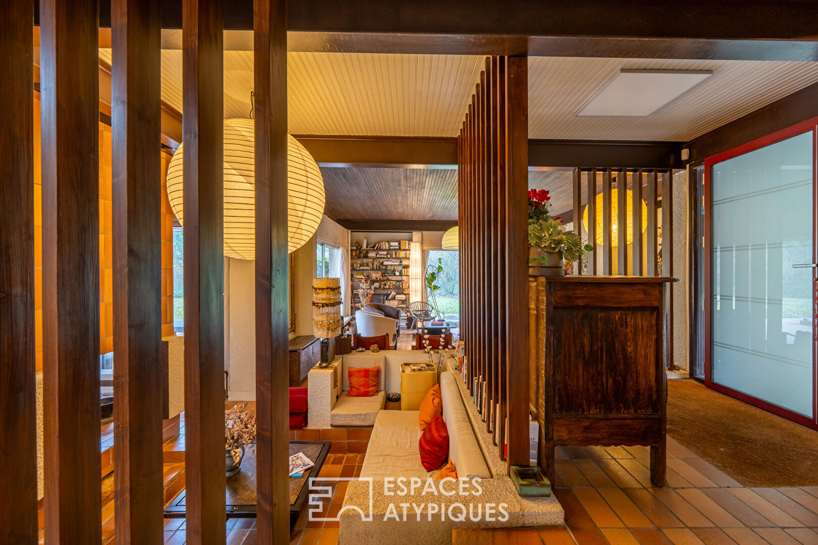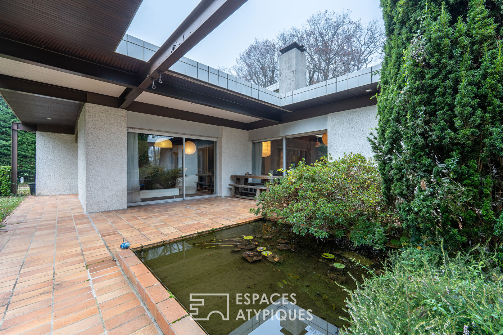 Pensée selon les codes de l’architecture usonienne du célèbre architecte Frank Lloyd Wright, la maison offre une vie de plain-pied agréable et fonctionnelle dans un cadré préservé aux portes de la ville.