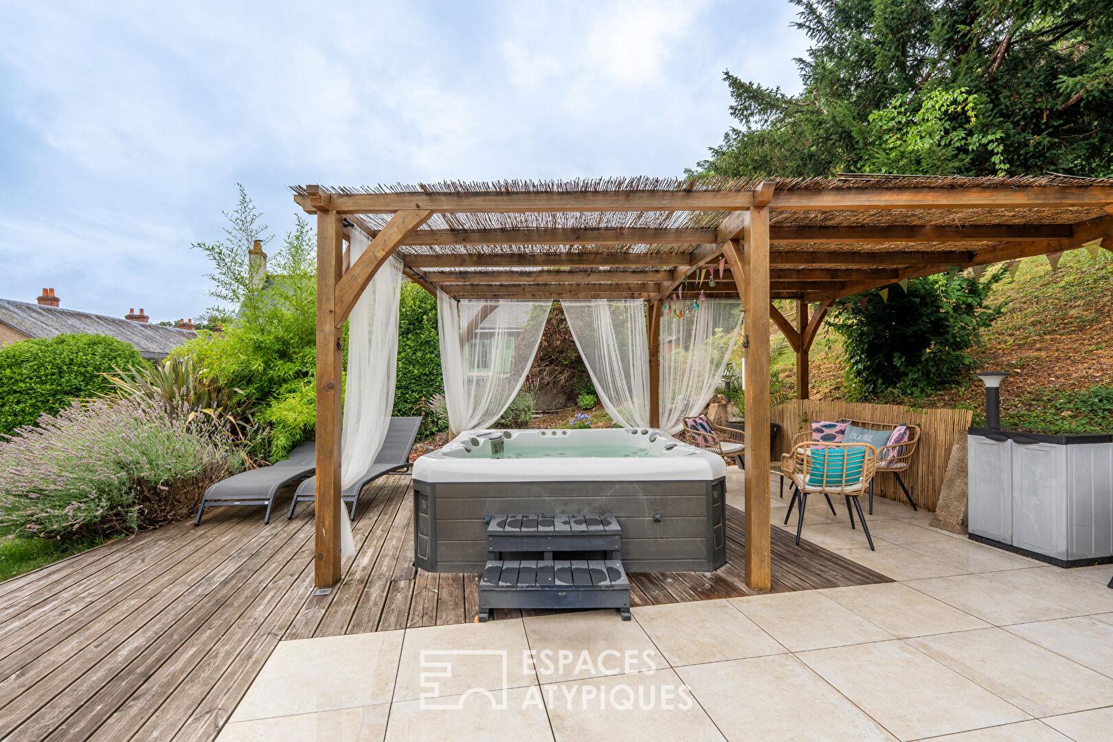 Côté extérieur, un grand terrain préservé comprenant une partie boisée garantit une intimité absolue et un cadre bucolique. Un espace privilégié agrémenté d’une terrasse en bois avec Jacuzzi et d’une cuisine d’été offre un cadre idéal pour des moments de partage en famille ou entre amis.