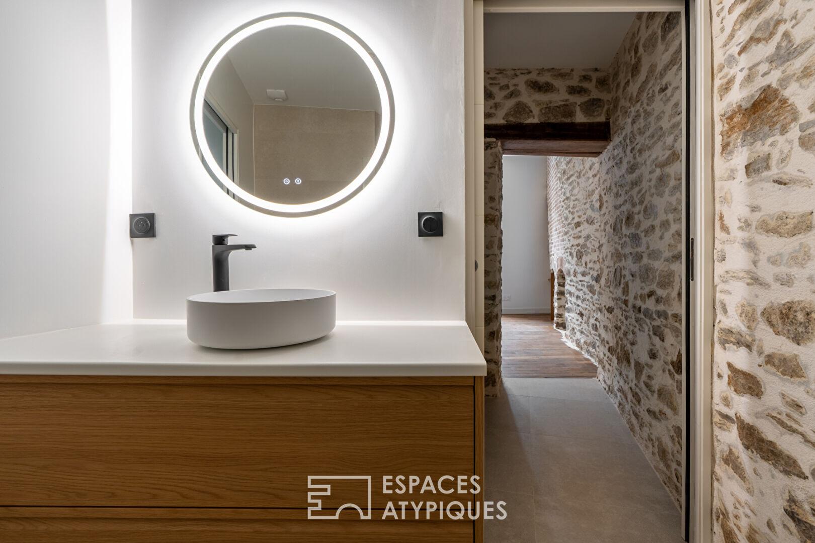 Dès le seuil franchi, la pierre apparente et les parquets d’origine patiemment restaurés dialoguent avec des finitions premium. L’espace de vie s’articule autour d’un salon élégant et d’une vaste cuisine dînatoire. Véritable coeur battant de l’appartement, cette dernière s’ouvre sur un jardin partagé, offrant une respiration suspendue et un horizon de verdure rare en centre-ville.