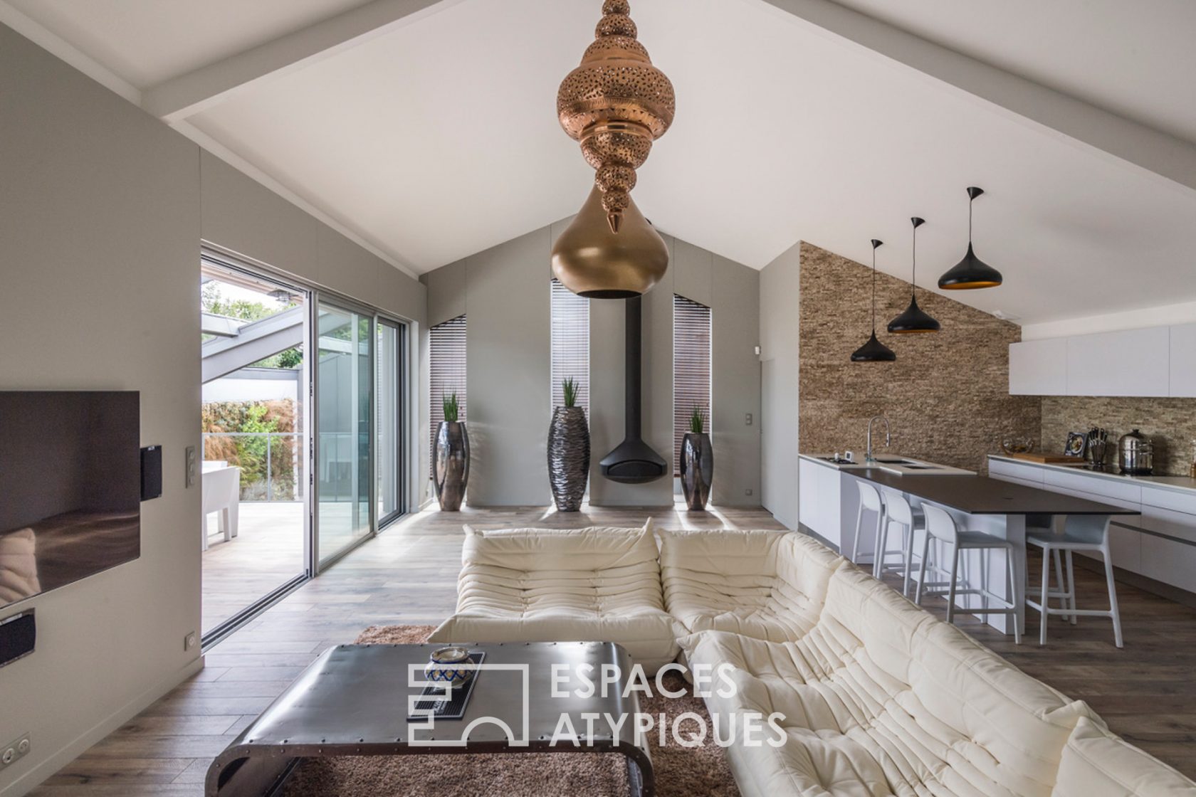 La partie salon avec sa cheminée Focus suspendue fait face à la grande terrasse intimiste de 45 m², exposée plein Sud.