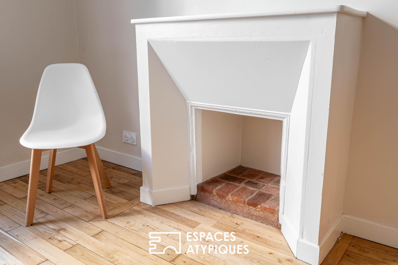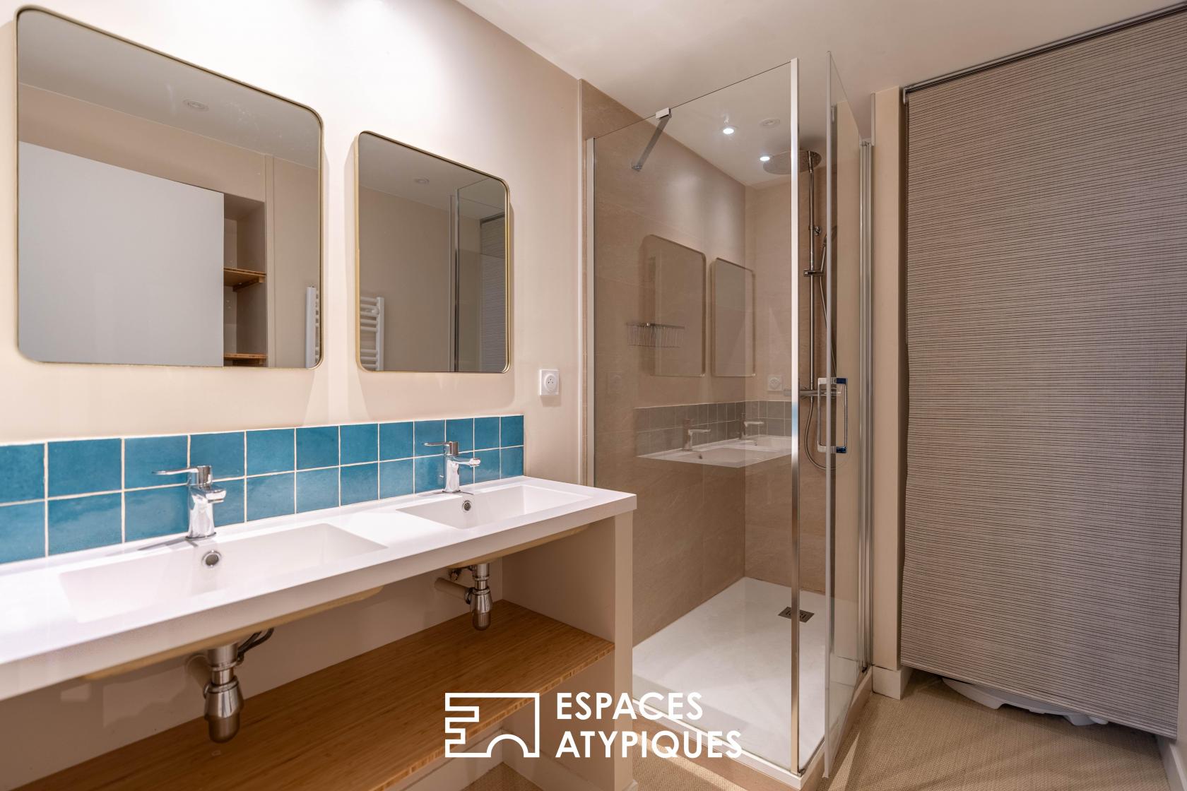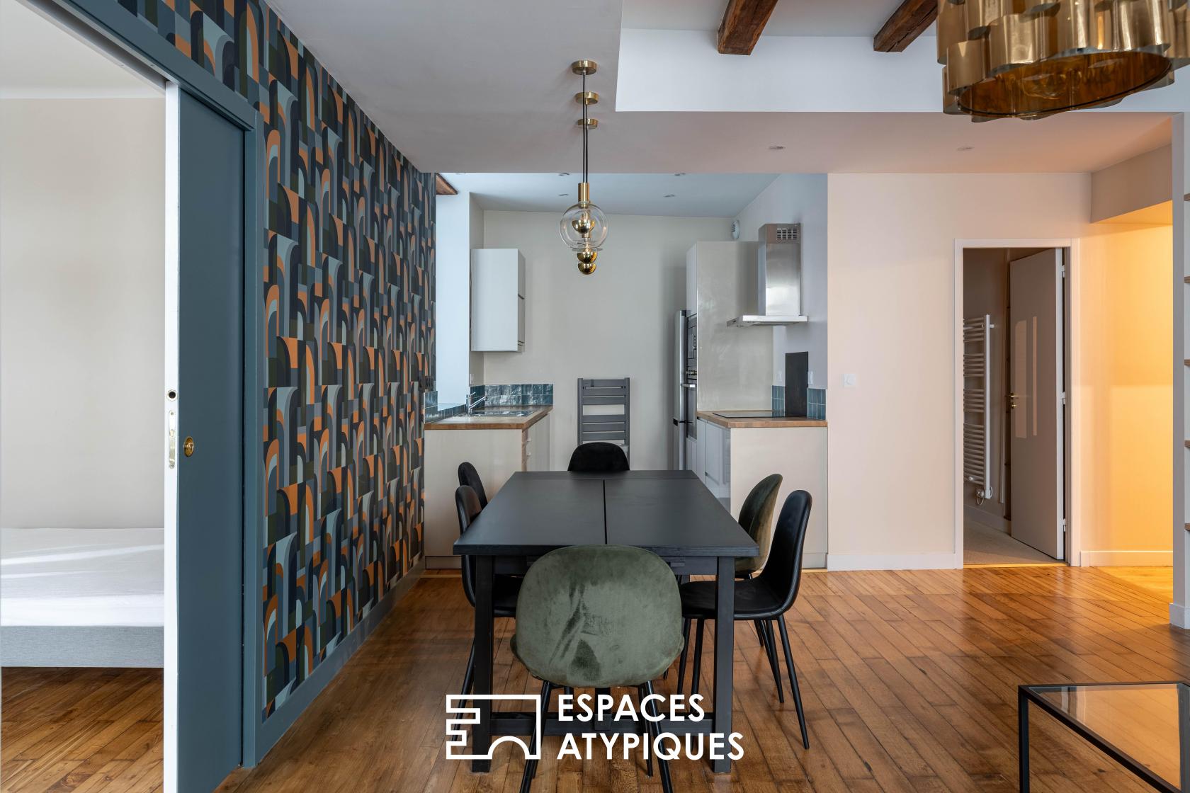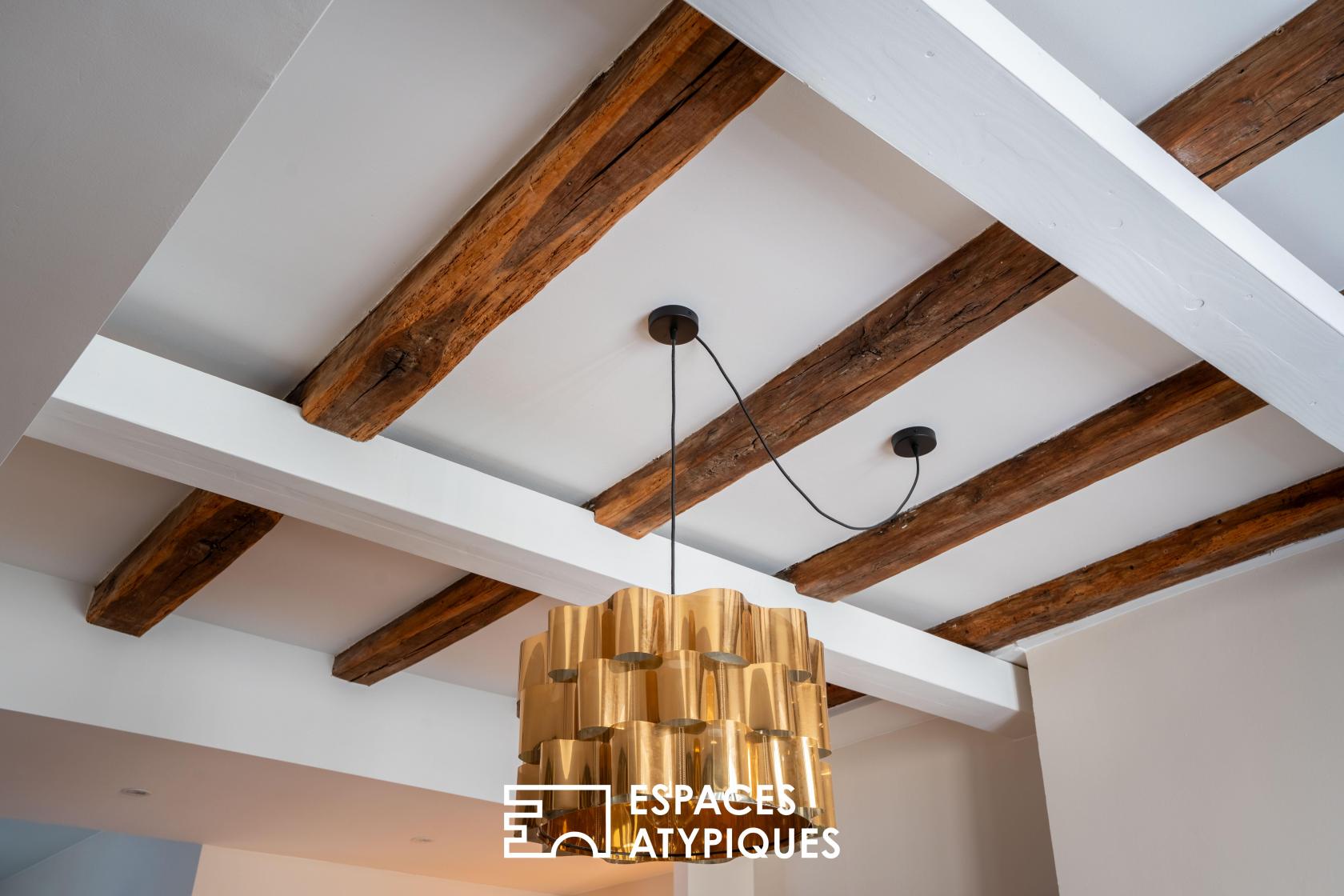 Le charme de l’ancien est pleinement préservé , poutres apparentes et parquet d’origine, tout en s’accordant harmonieusement avec une décoration résolument contemporaine.