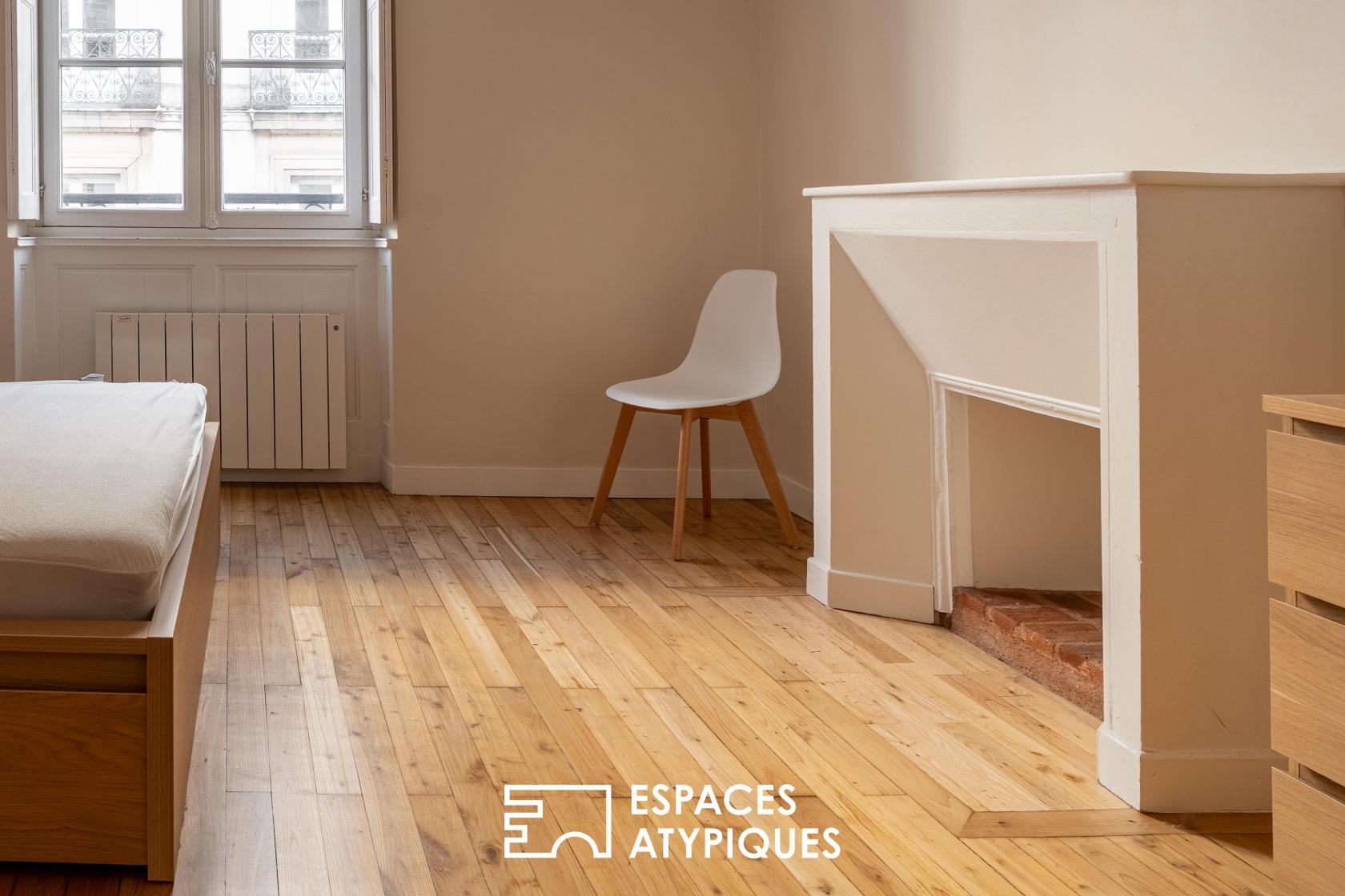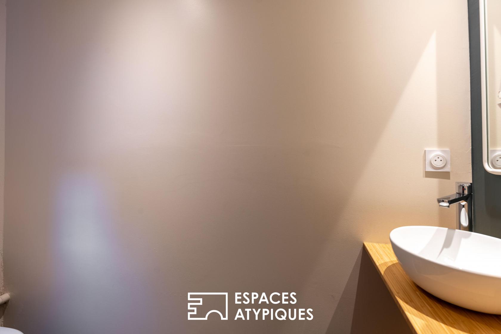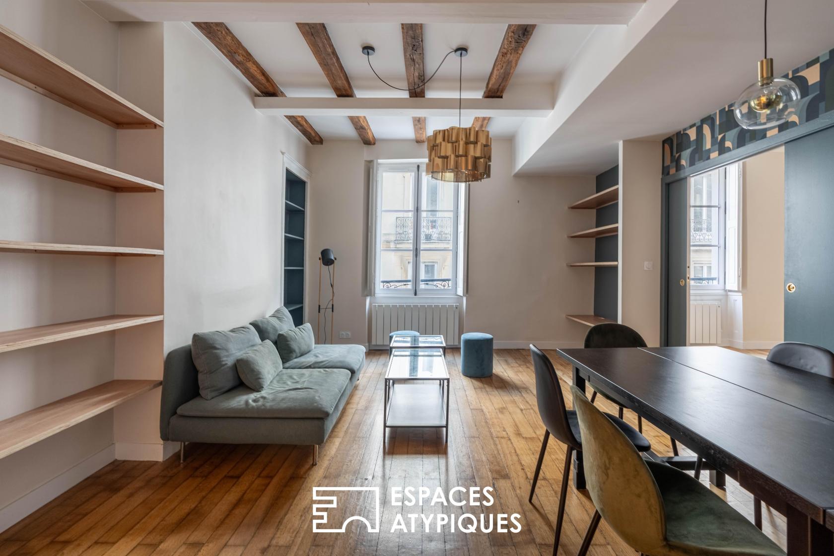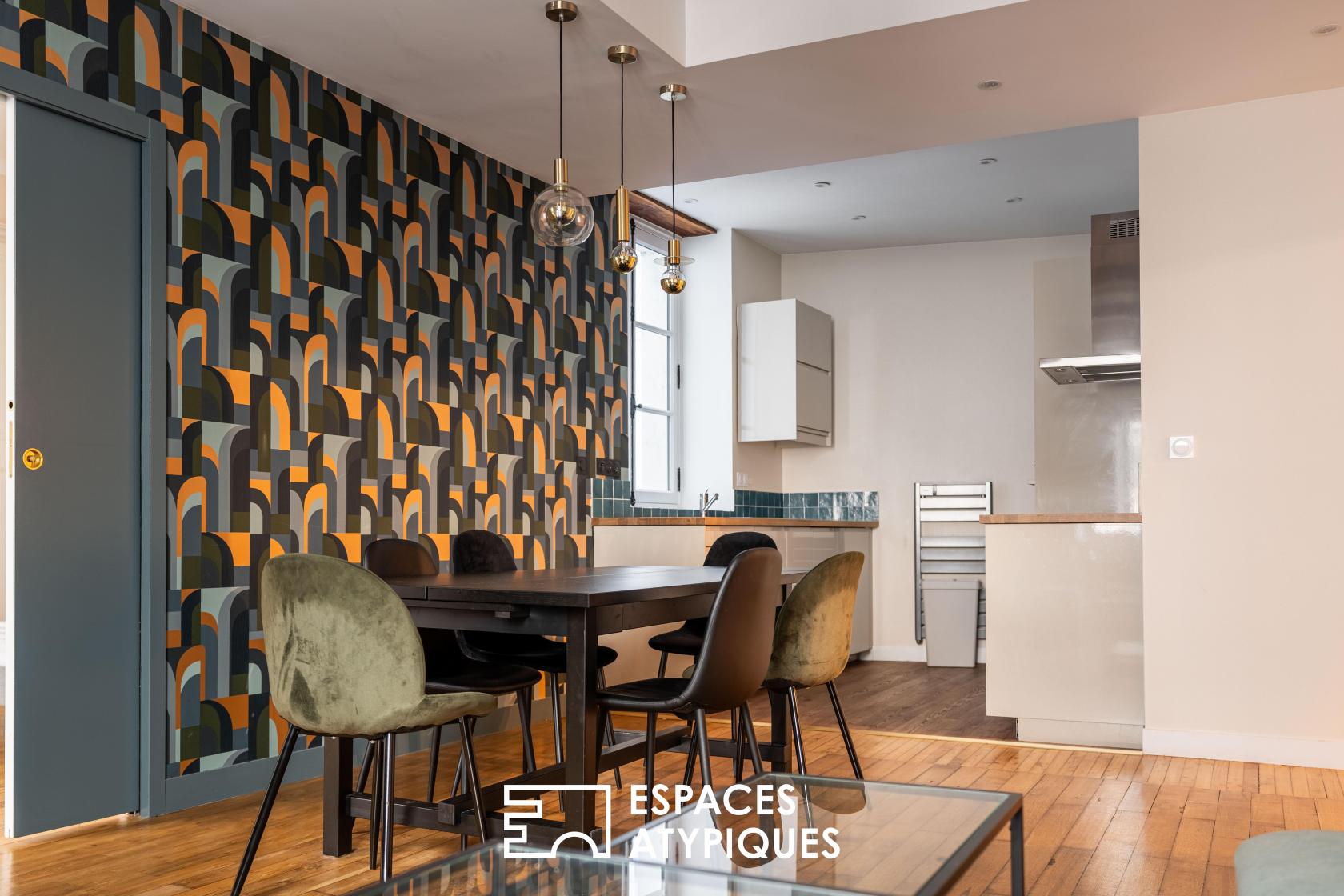 Le charme de l’ancien est pleinement préservé , poutres apparentes et parquet d’origine, tout en s’accordant harmonieusement avec une décoration résolument contemporaine.