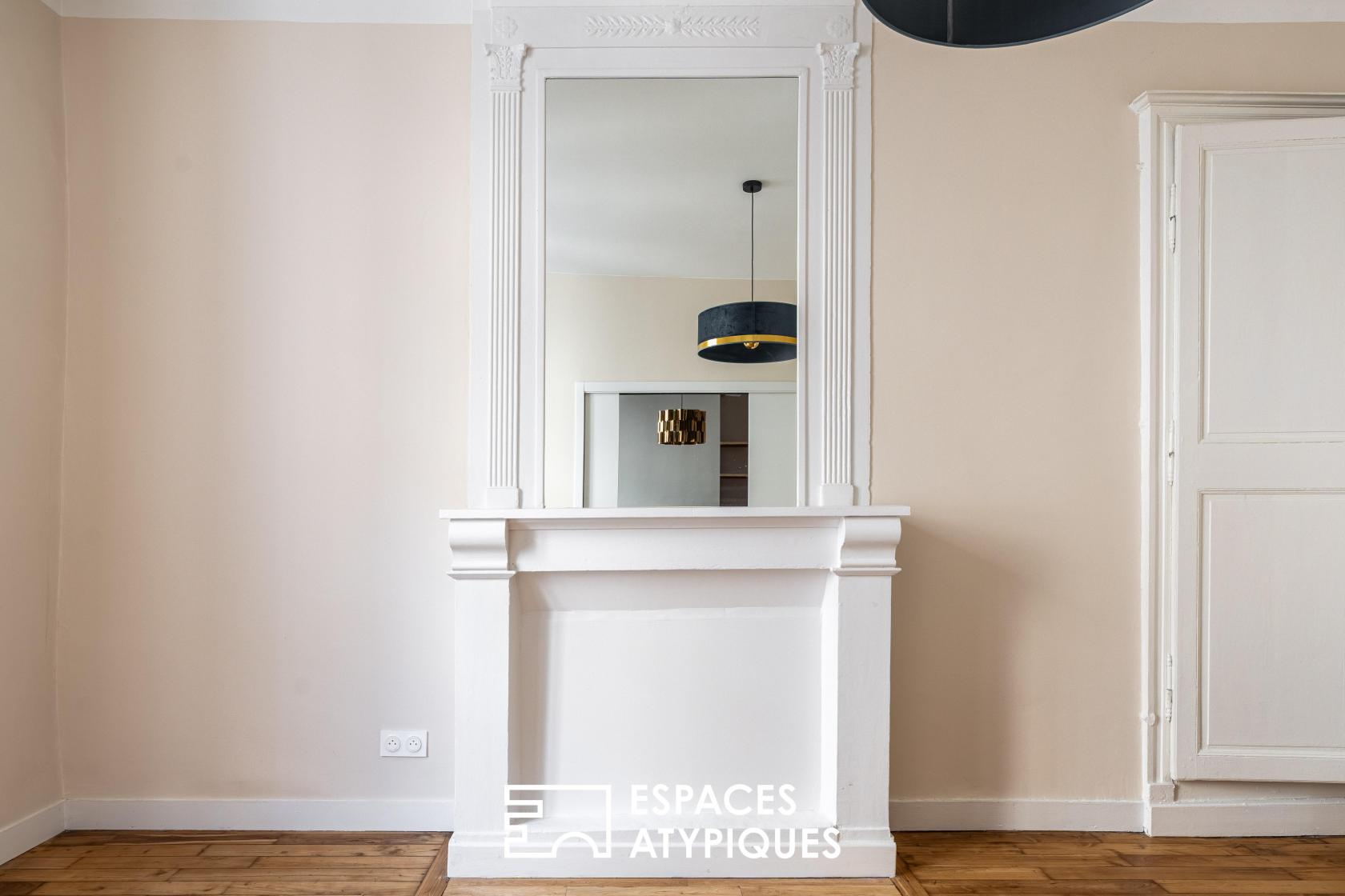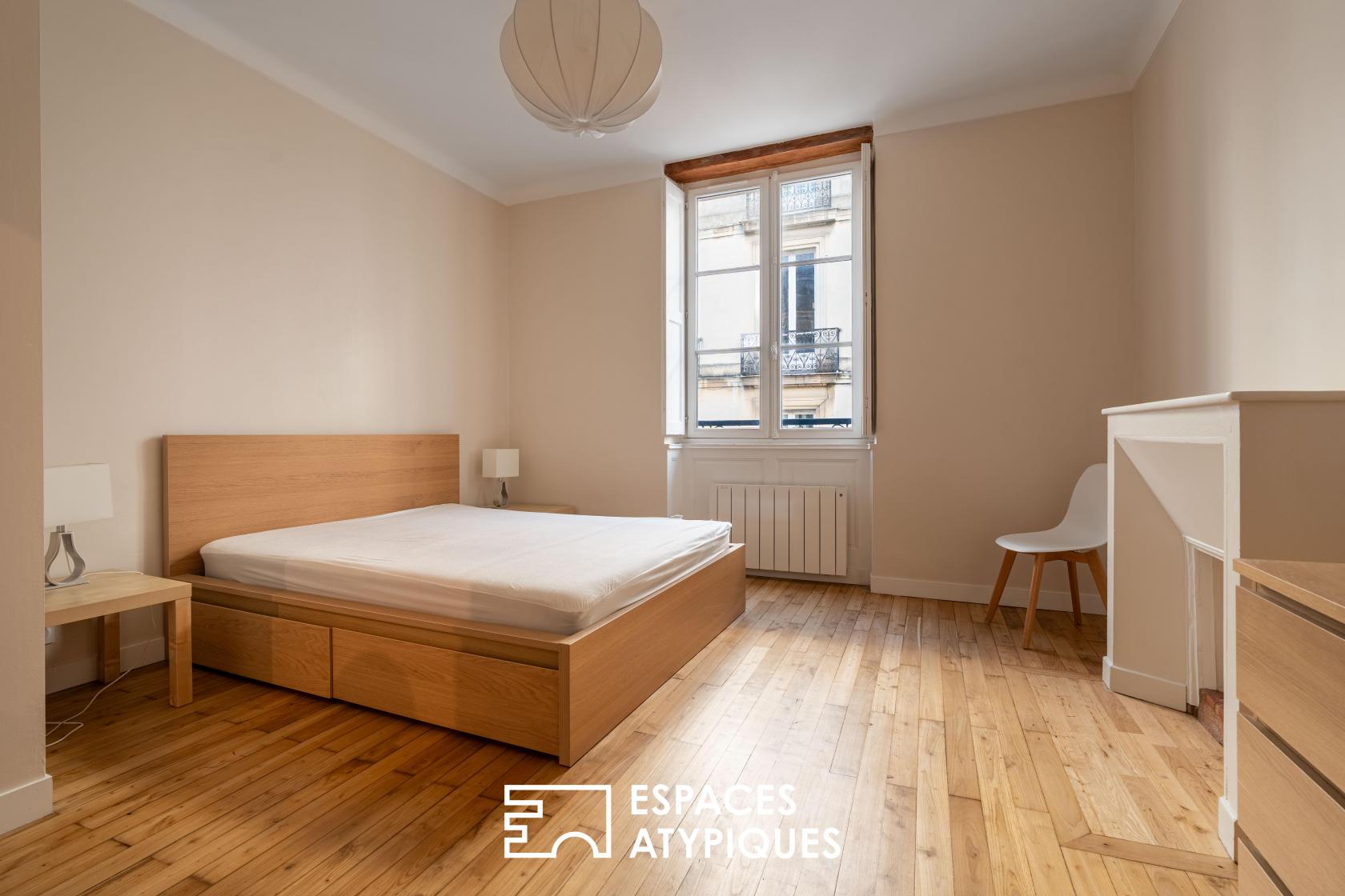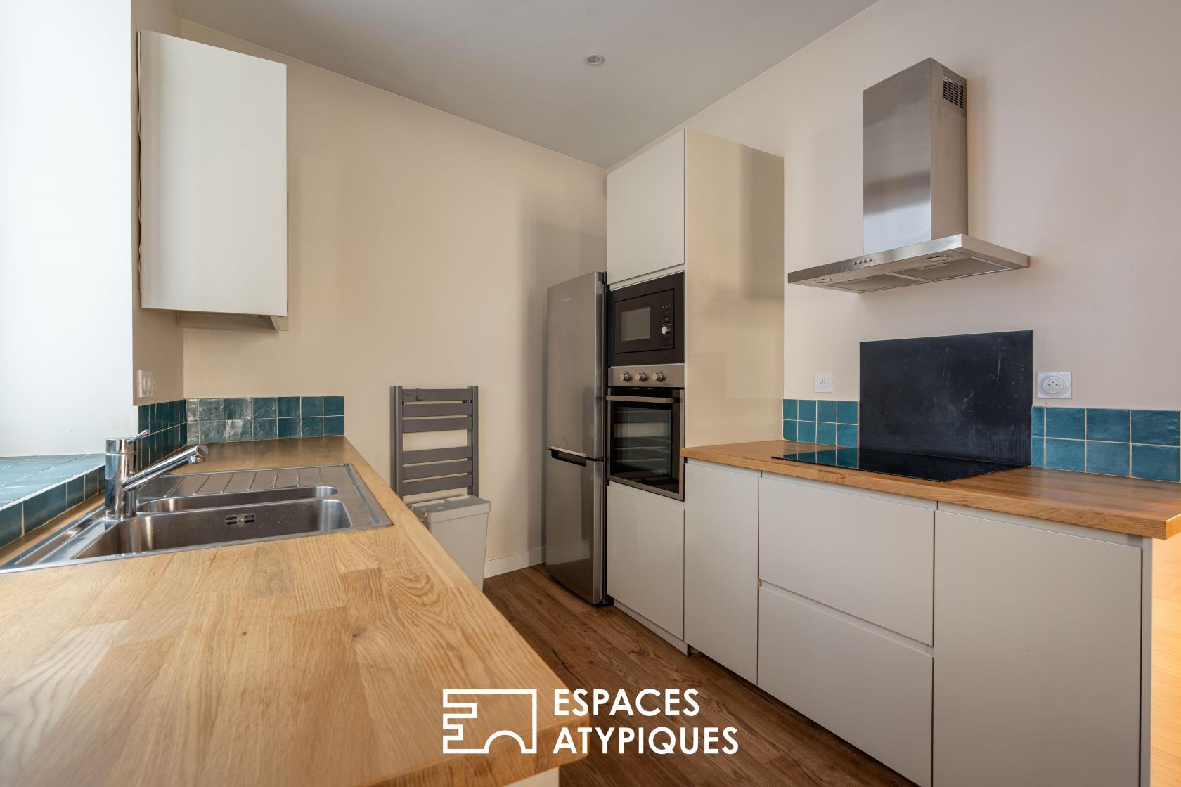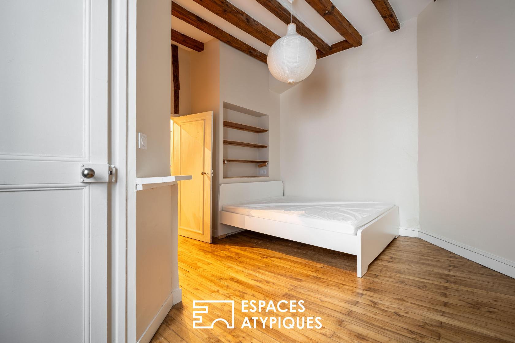 Le charme de l’ancien est pleinement préservé , poutres apparentes et parquet d’origine, tout en s’accordant harmonieusement avec une décoration résolument contemporaine.