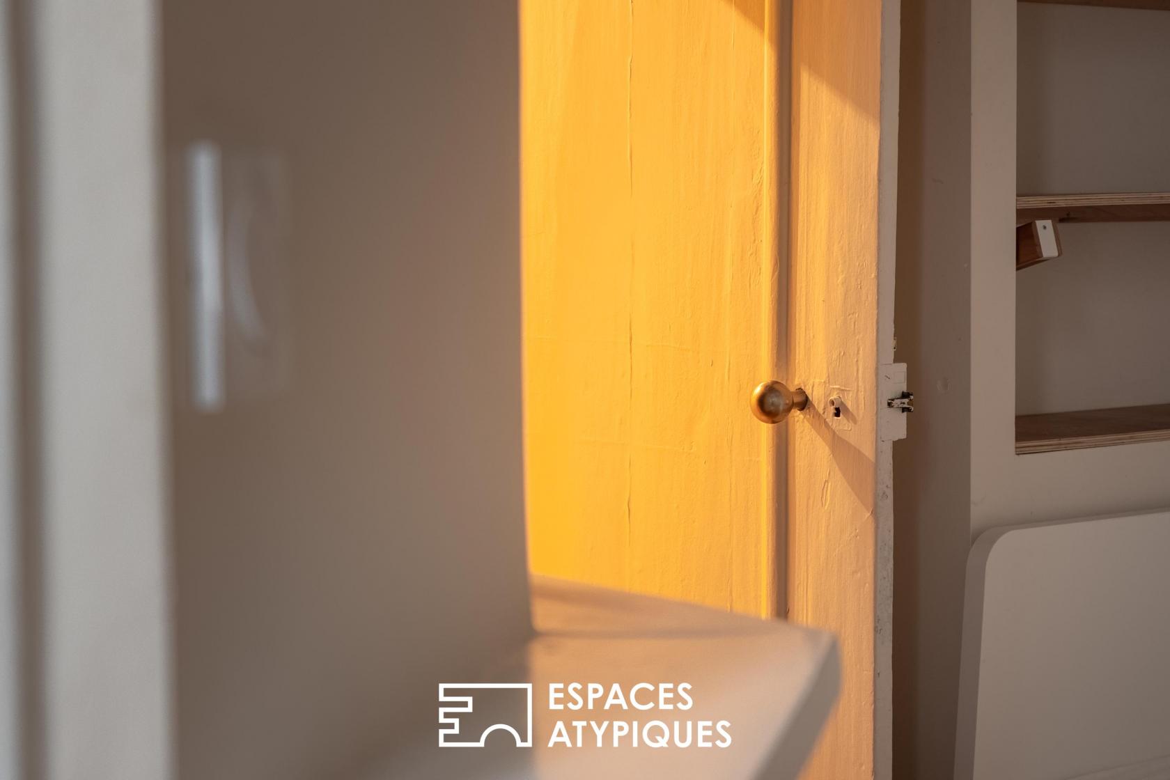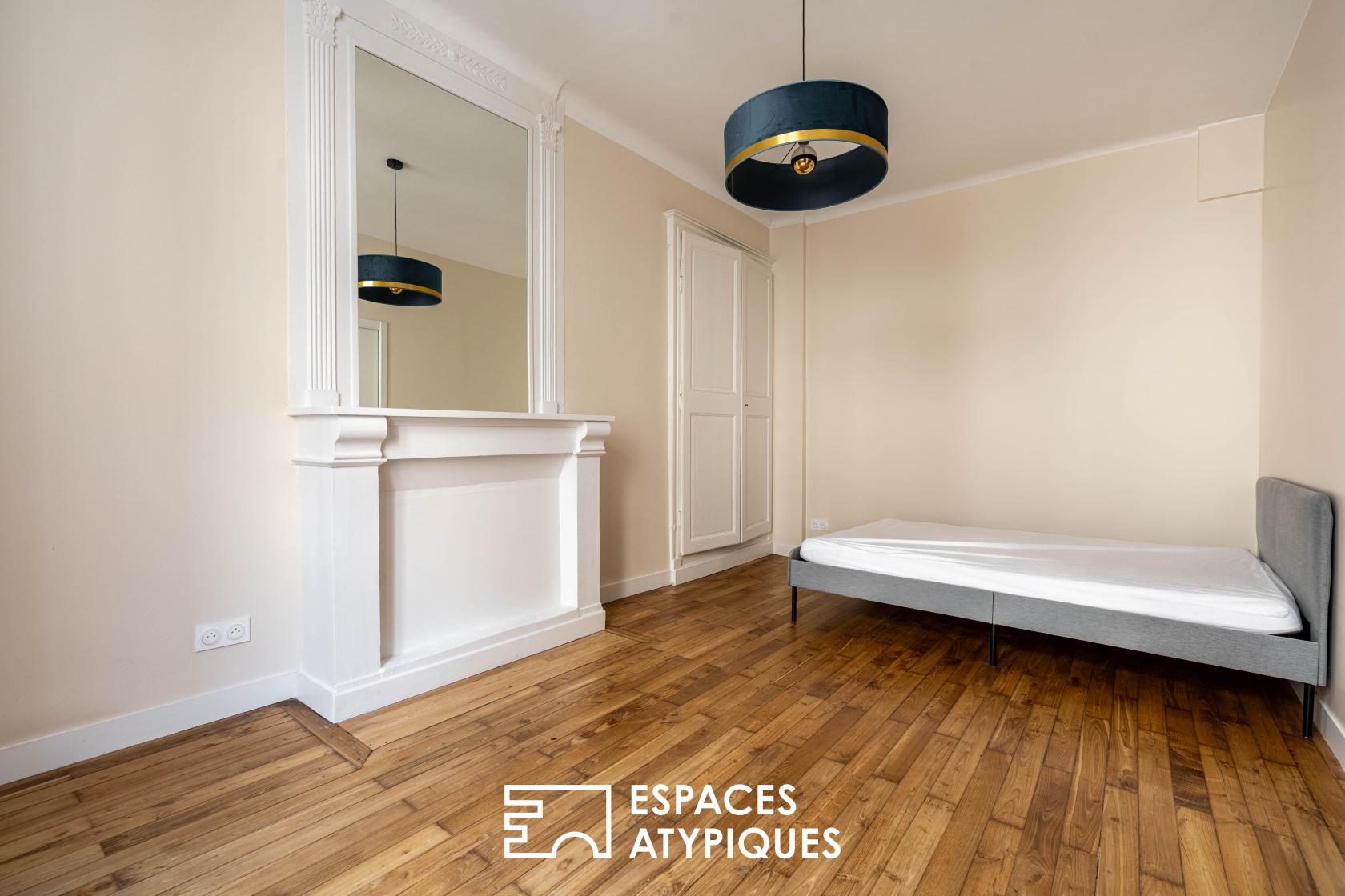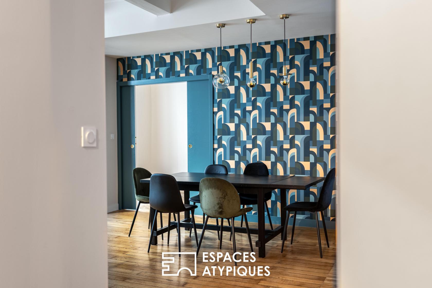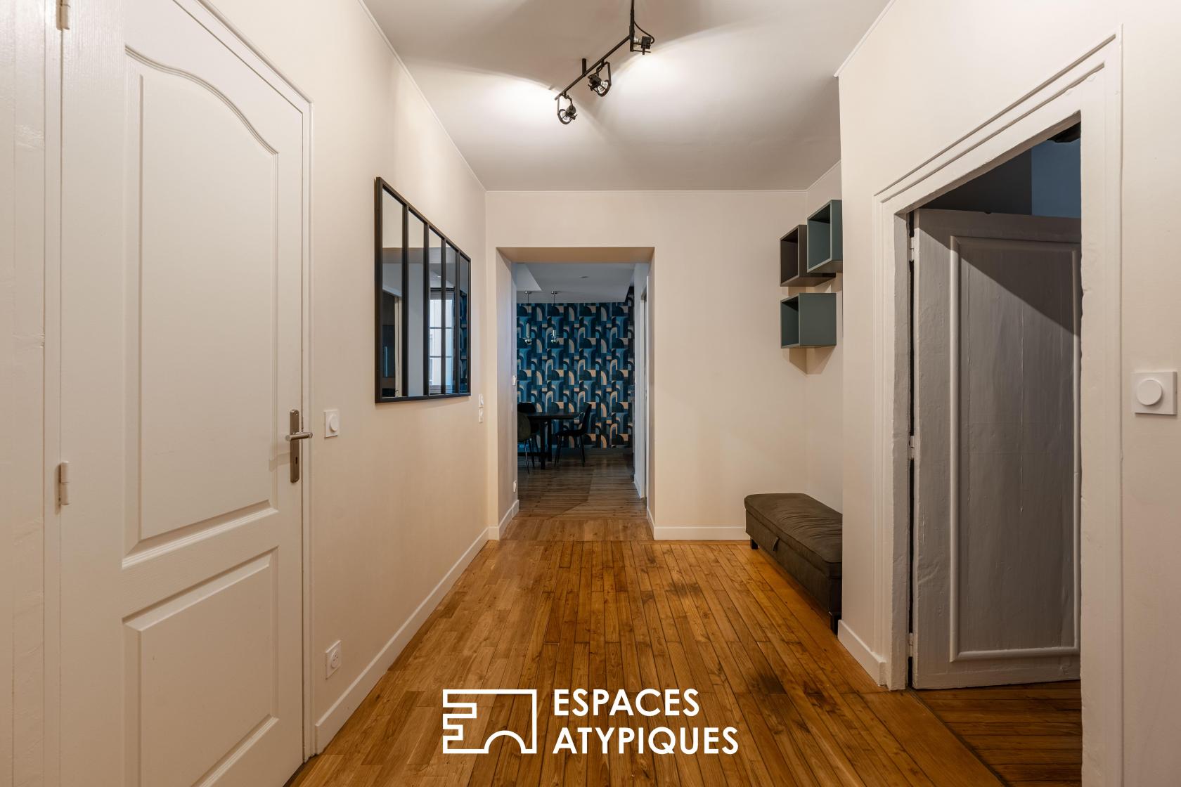 Le charme de l’ancien est pleinement préservé , poutres apparentes et parquet d’origine, tout en s’accordant harmonieusement avec une décoration résolument contemporaine.