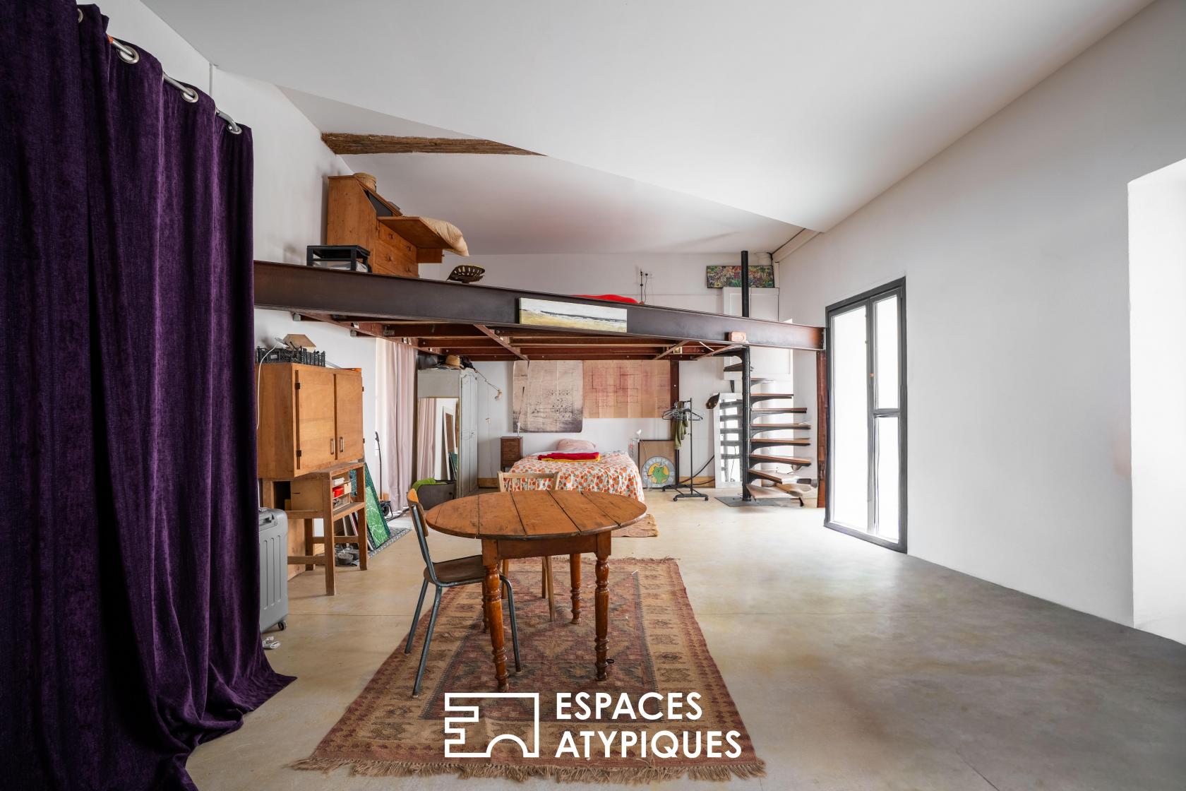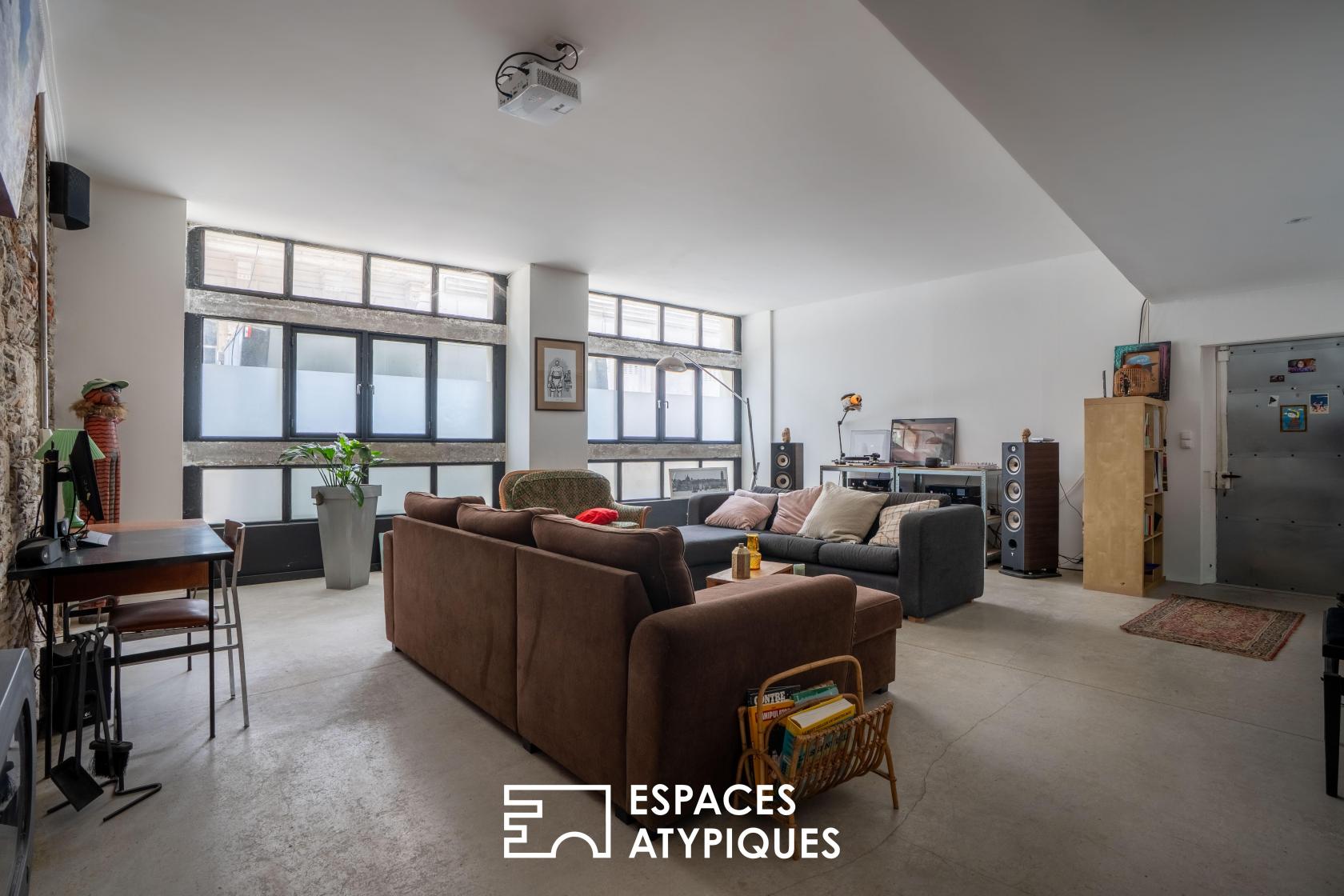 Son emplacement stratégique et son accès en rez-de-chaussée en font un lieu idéal pour une profession libérale, un atelier d’artiste ou un habitat singulier pour les amateurs de volumes bruts.