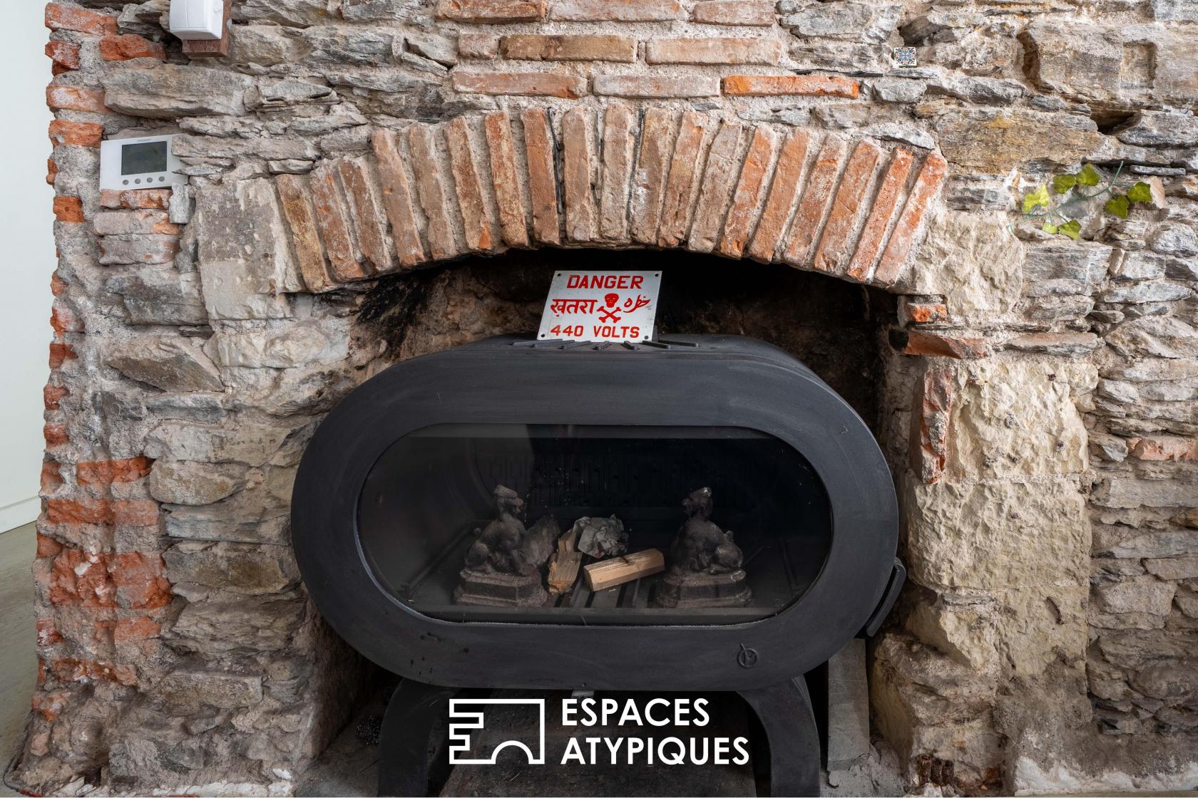 Loin des standards aseptisés, l’appartement joue la carte de l’intimité. Le rez-de-chaussée est ici pensé comme un refuge protecteur, une « galerie de vie » où la texture des matériaux anciens crée une ambiance feutrée et chaleureuse, sublimée par un poêle à bois design.
