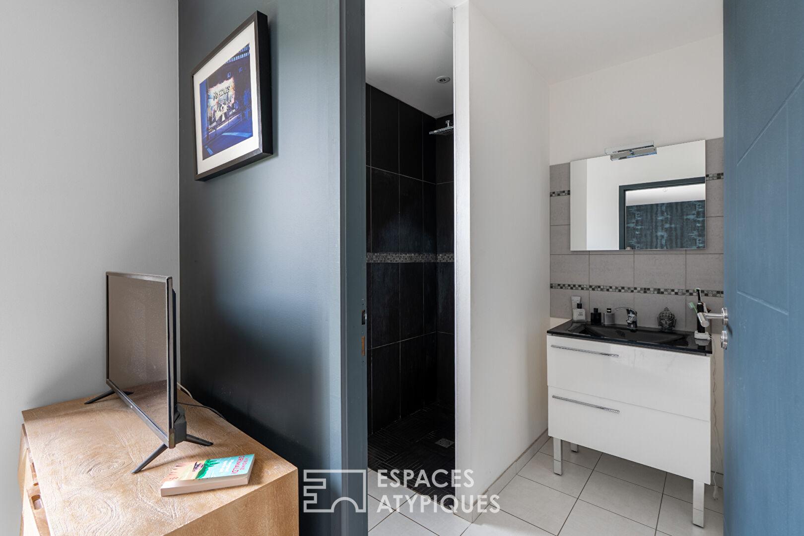 La cuisine, parfaitement aménagée et équipée, prolonge cette harmonie avec fluidité, accompagnée d’une arrière-cuisine aussi discrète qu’indispensable. Le salon, lui, révèle un espace bureau subtilement dessiné par une verrière, comme une parenthèse studieuse au coeur du lieu de vie.