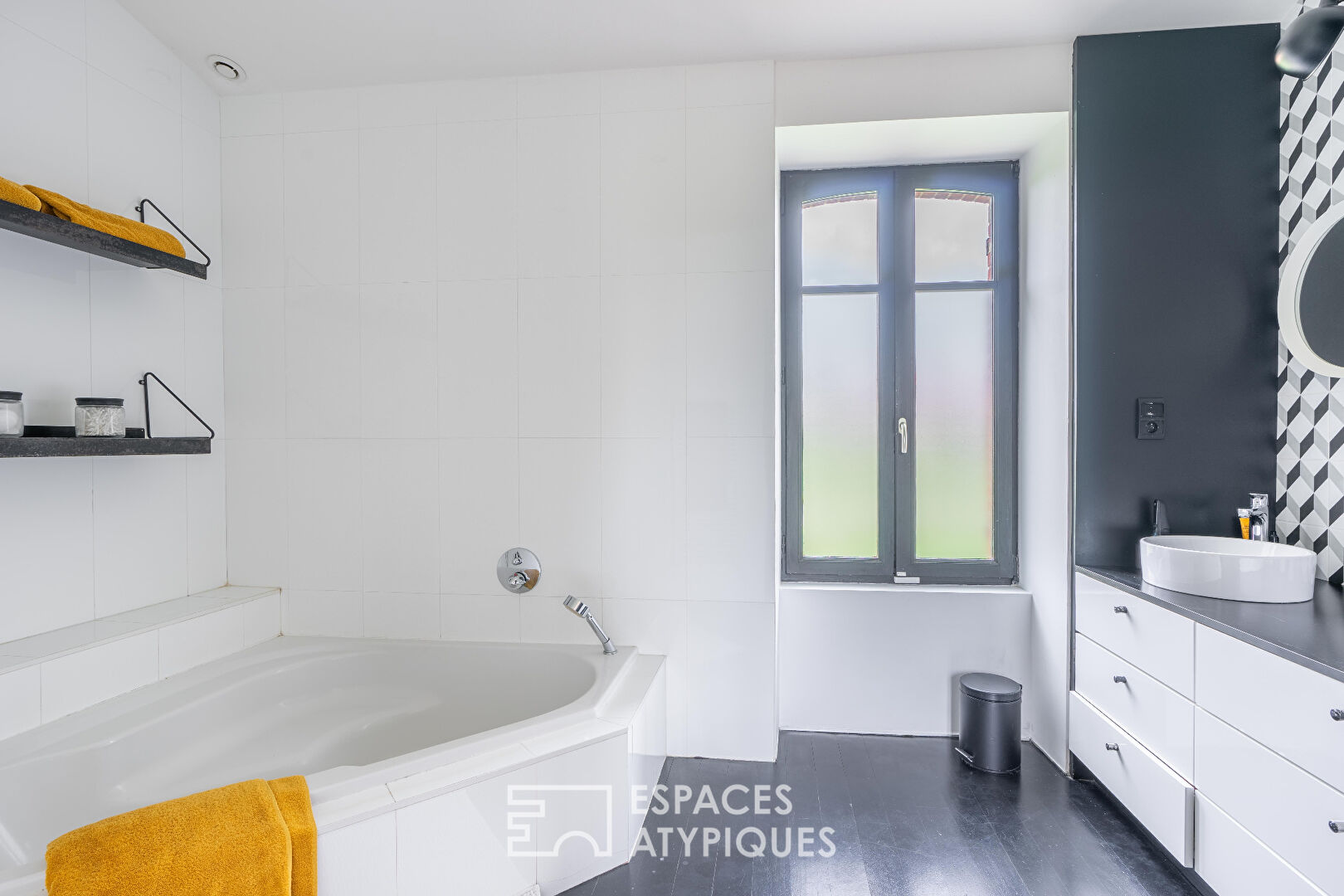 Située dans un hameau, loin des nuisances sonores, à 5 min du bourg de Haute-Goulaine, cette rénovation de qualité a été entièrement repensée par un architecte d’intérieur. Il a opté pour une décoration contemporaine tout en conservant l’architecture d’origine. A l’intérieur, certains murs sont en chêne clair et les sols en béton ciré.