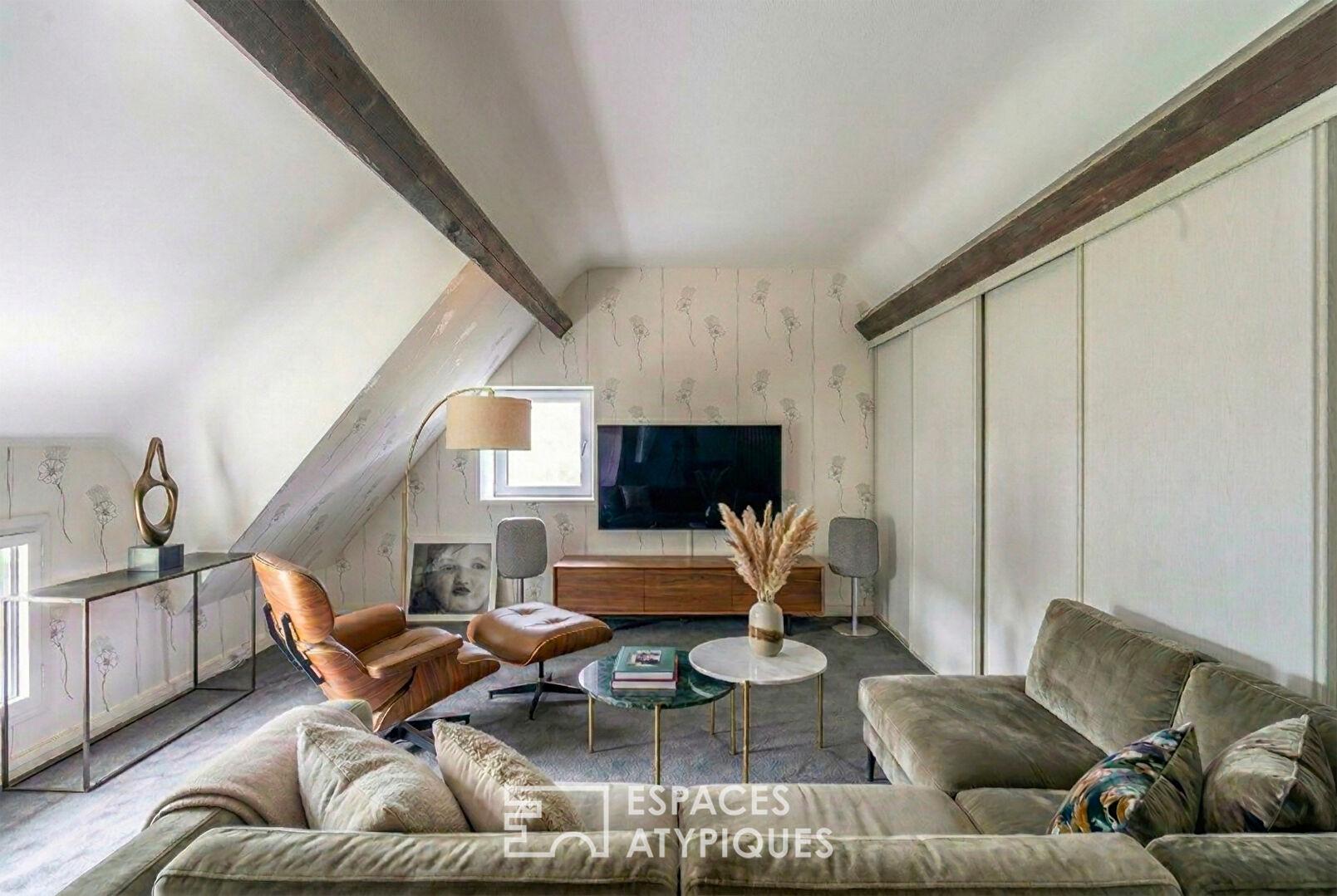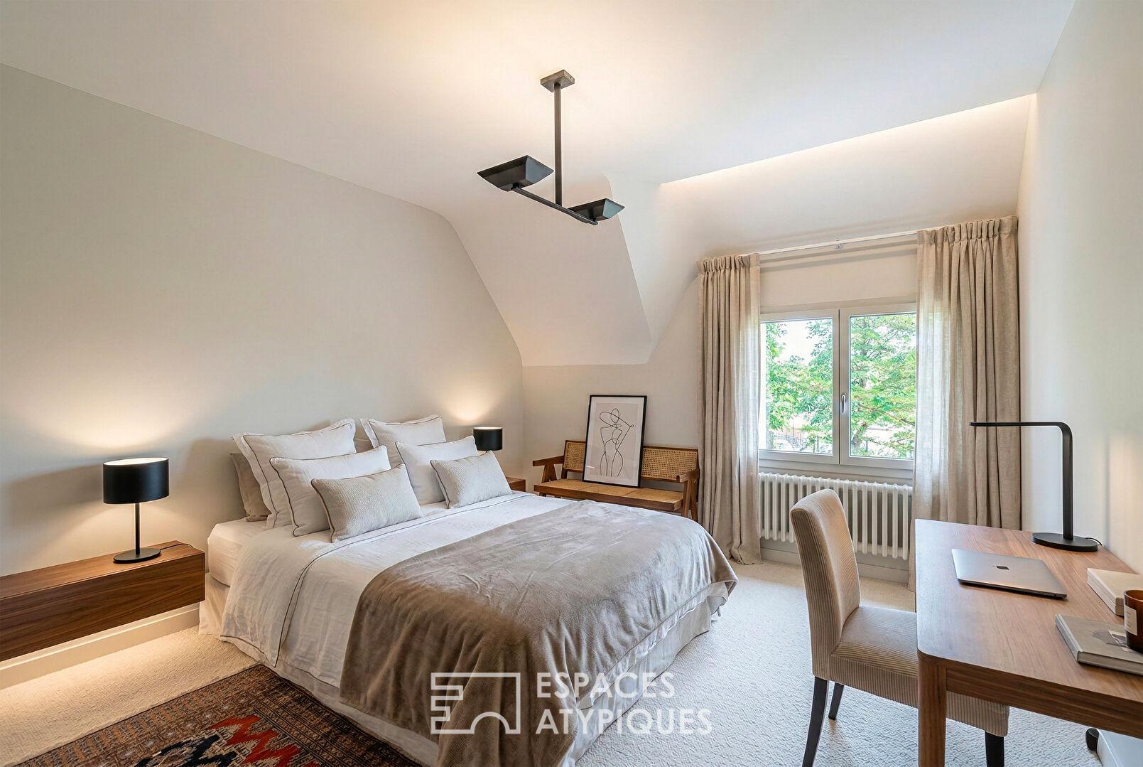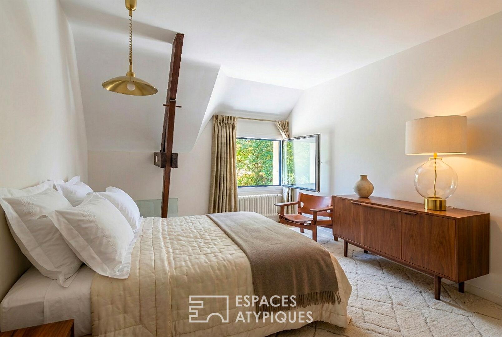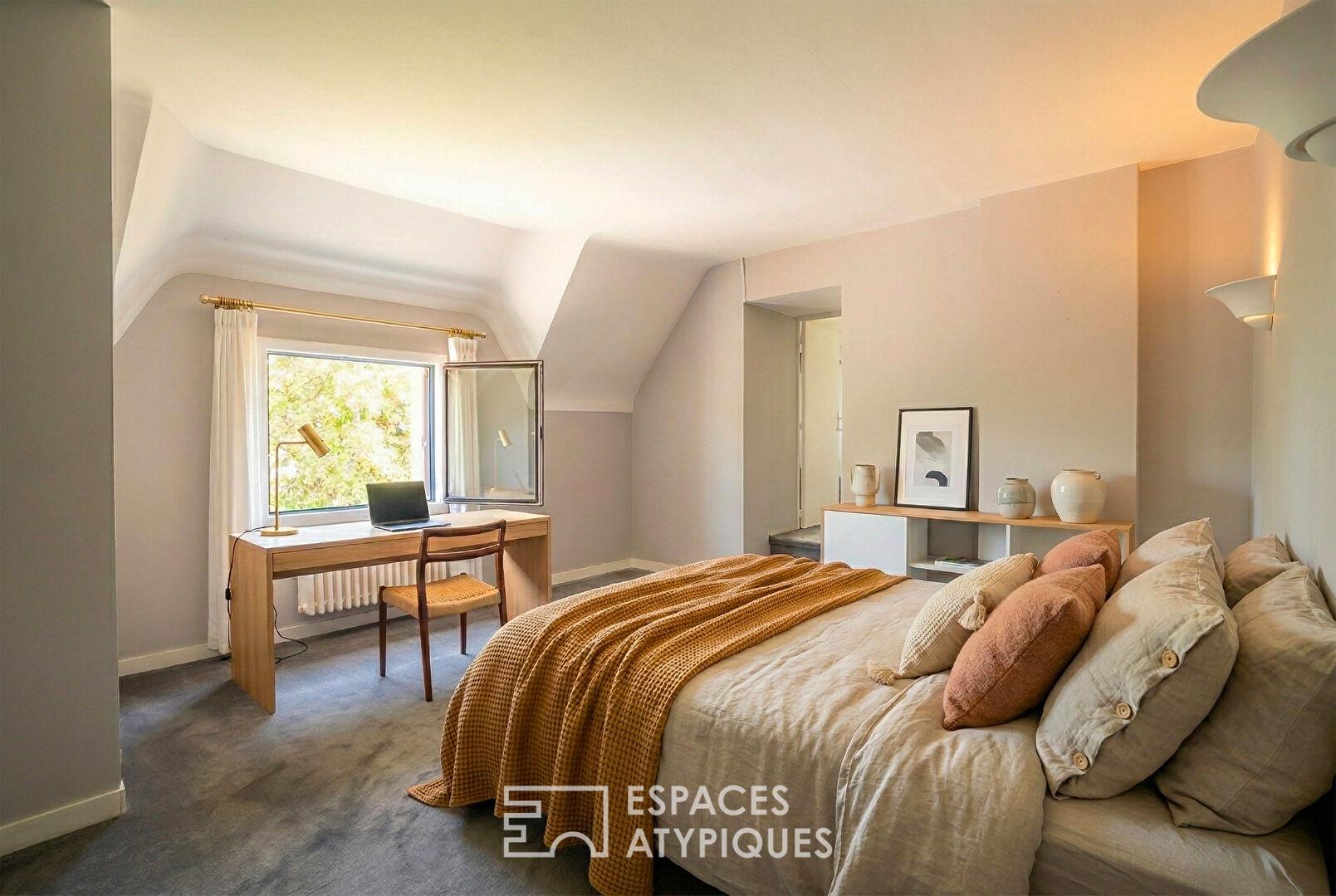 À l’étage, le palier distribue trois chambres, une salle d’eau ainsi qu’une belle suite parentale avec dressing, salle de bains et wc ainsi qu’un espace salon-détente.