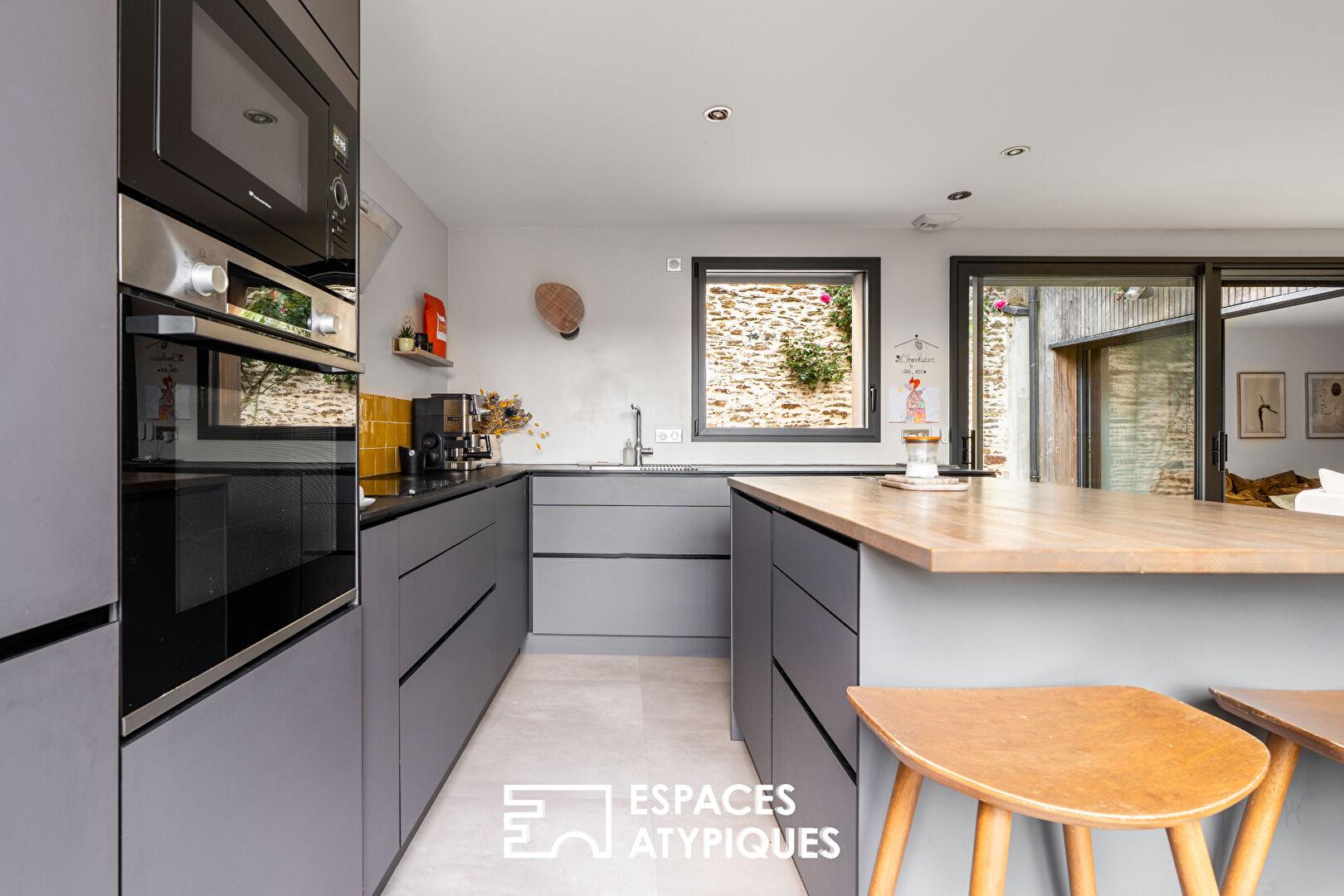 La cuisine, sobre, élégante et parfaitement fonctionnelle, s’organise autour d’un îlot central convivial. Elle s’inscrit pleinement dans cette démarche esthétique, où chaque matériau est choisi pour dialoguer avec l’autre sans jamais surcharger l’espace.