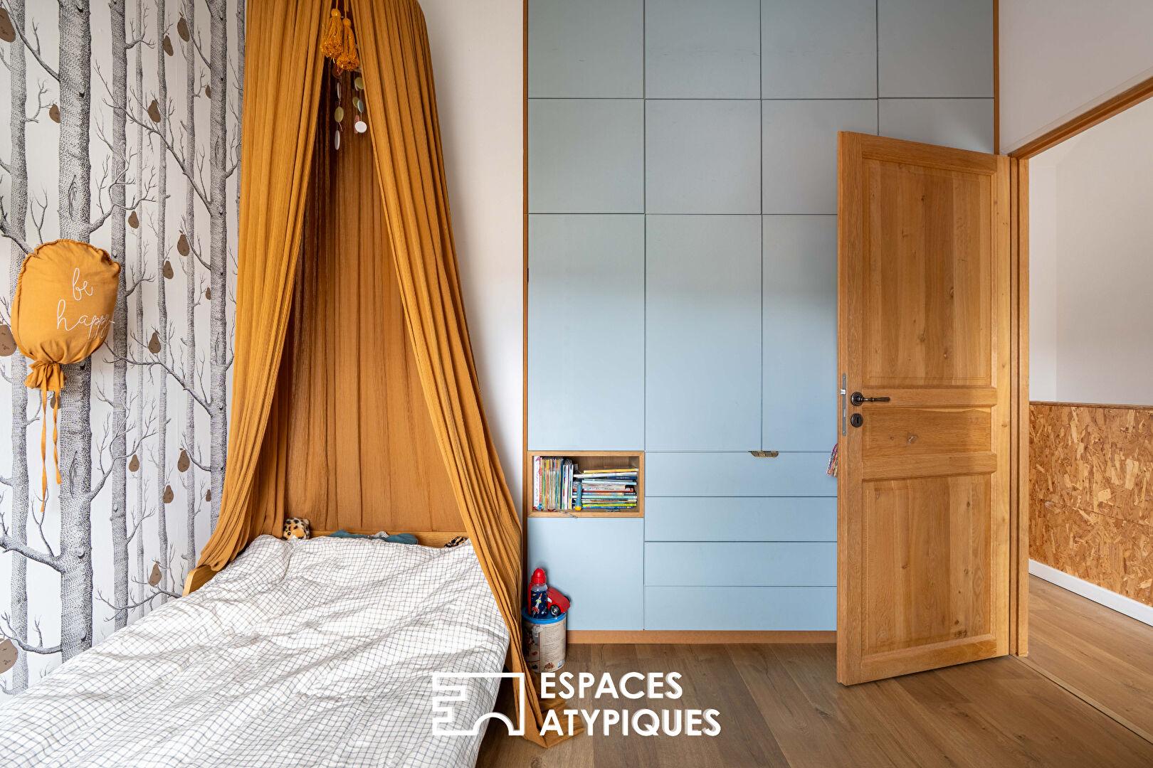 Le second étage accueille deux chambres supplémentaires, dont une bénéficiant d’un rangement sur mesure parfaitement intégré et optimisé, une salle de bain avec WC, ainsi qu’un espace bureau.