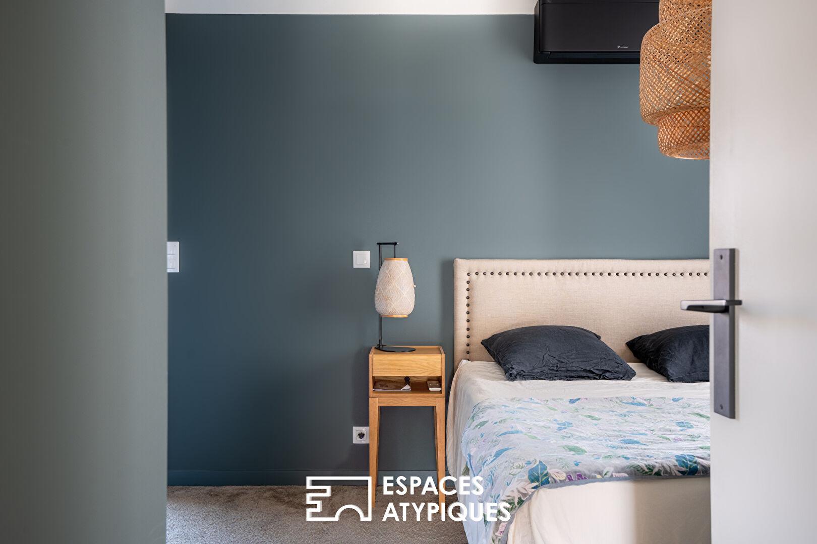 Dès l’entrée, la lumière s’impose comme un véritable fil conducteur. La pièce de vie, généreuse et résolument design, bénéficie de larges ouvertures sur l’extérieur, créant une continuité naturelle avec la terrasse et la piscine. La cuisine aménagée et entièrement équipée, parfaitement intégrée, conjugue esthétisme et convivialité. Elle est complétée par une lingerie puis un cellier.