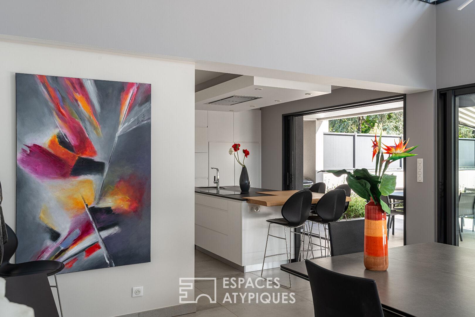 Dès l’arrivée, une allée aux inspirations japonisantes traverse un jardin d’accueil minutieusement pensé. L’architecture extérieur affirme une personnalité forte, avec une façade graphique et dynamique, où les volumes jouent la légèreté et la transparence à travers de grandes ouvertures tournées vers le jardin.