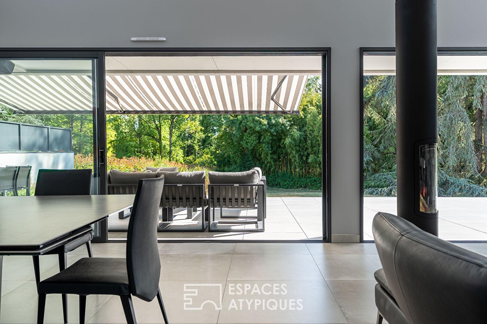 Développée de plain-pied, la maison s’ouvre sur une vaste pièce de vie baignée de lumière, où les stores californiens rythment subtilement les jeux d’ombre et de transparence. Celle-ci se prolonge par une large terrasse plein sud, tournée vers le jardin intime où s’élèvent de grands arbres majestueux, véritables piliers végétaux qui encadrent l’espace.