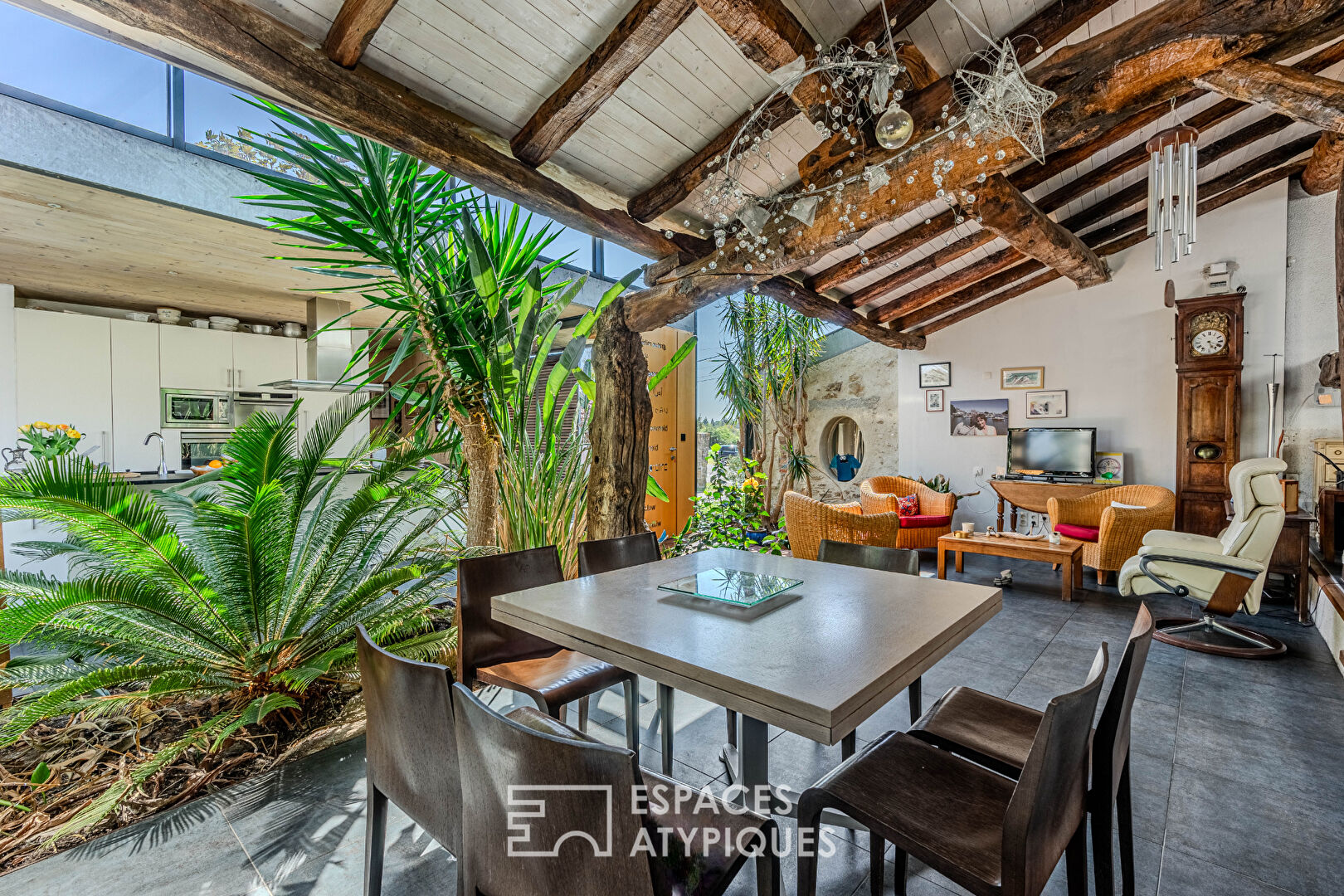 Dès l’entrée, le ton est donné, un jardin d’hiver sous verrière, véritable pièce à part entière, guide le regard vers une pièce de vie d’ampleur. La cheminée suspendue en est le coeur, mais ce sont les poutres centenaires, authentiques et pleines de caractère, qui donnent à l’ensemble sa profondeur et son âme.