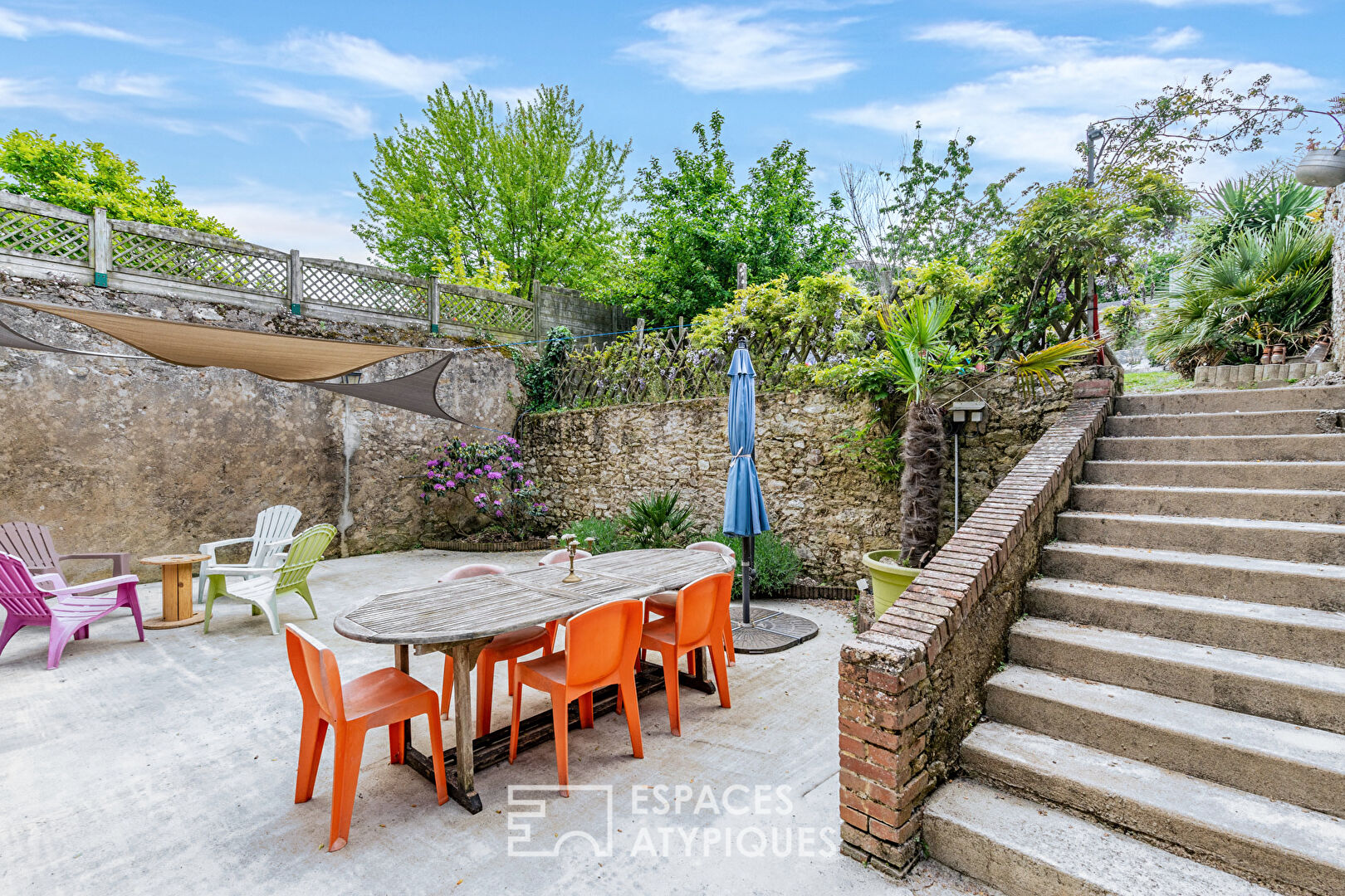 Un sous-sol total divisé en deux caves, accueille une pièce organisée en bar, un espace buanderie/chaufferie. La terrasse et le jardin entièrement clos de mur invitent au délassement, à la lecture. Une dépendance viabilisée en fond de jardin vient compléter ce bien.
