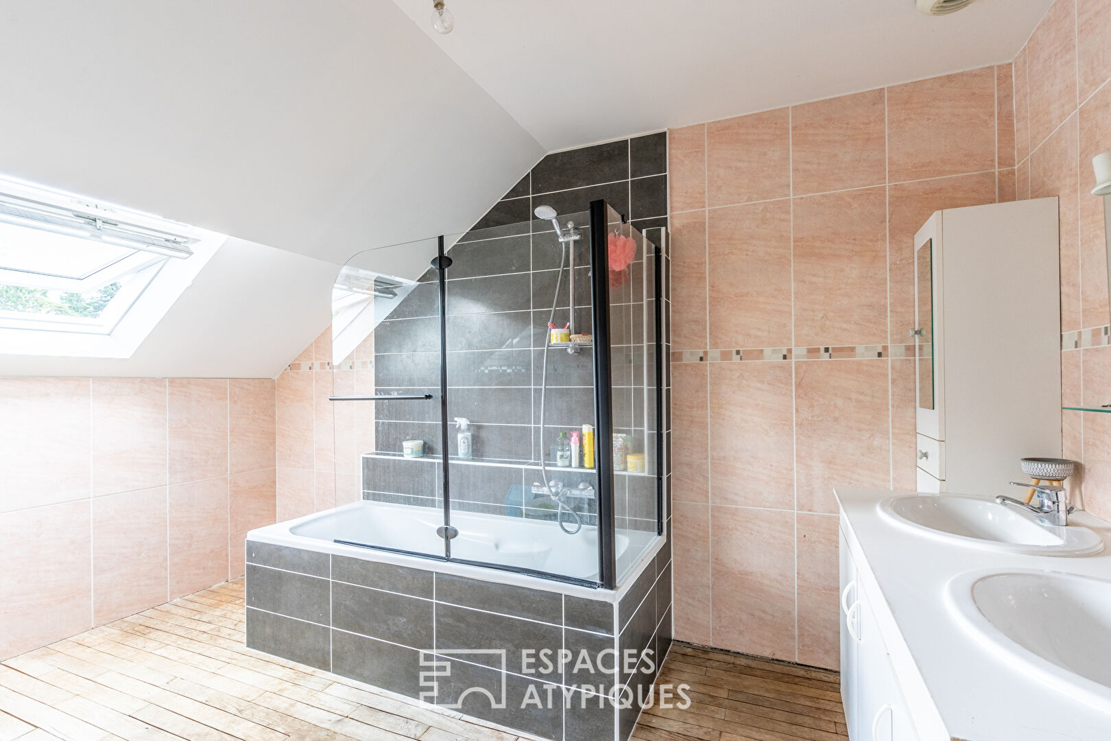 Un grand hall d’entrée dont les carreaux de ciment anciens ont été conservés, donne le ton. Il dessert un séjour orné d’un magnifique miroir Napoléon III, une vaste bibliothèque et une cuisine aménagée et équipée prolongée par un espace dînatoire. Le tout baignant de lumière grâce à son exposition Est/Ouest donnant sur la terrasse et le jardin. L’étage supérieur, desservi par un escalier en bois, surprend par le nombre de pièces.