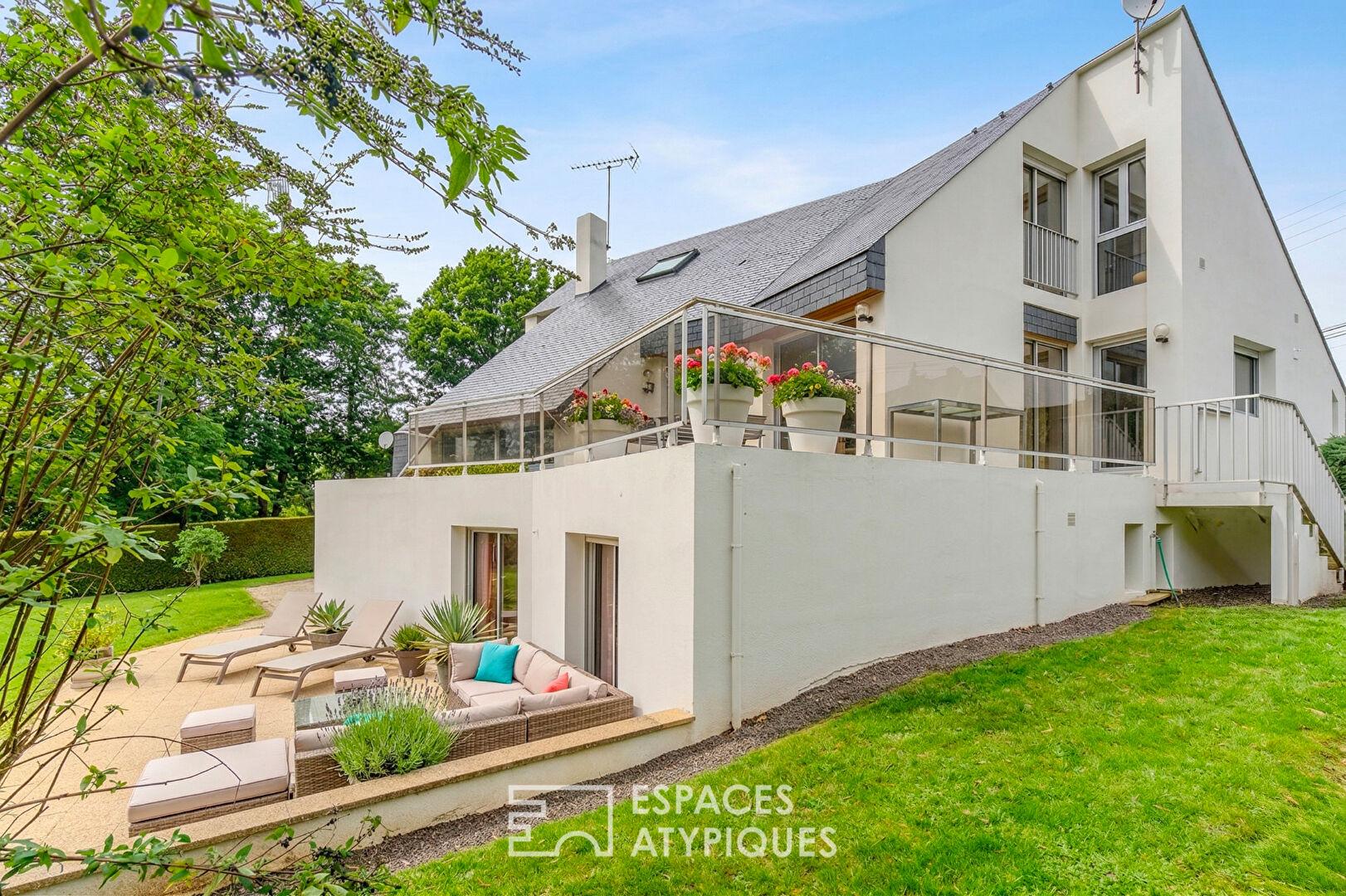 Édifiée dans les années 80 par un architecte, cette maison de caractère développe 180 m² habitables (environ 300 m² au sol) dans un environnement privilégié, plein sud.