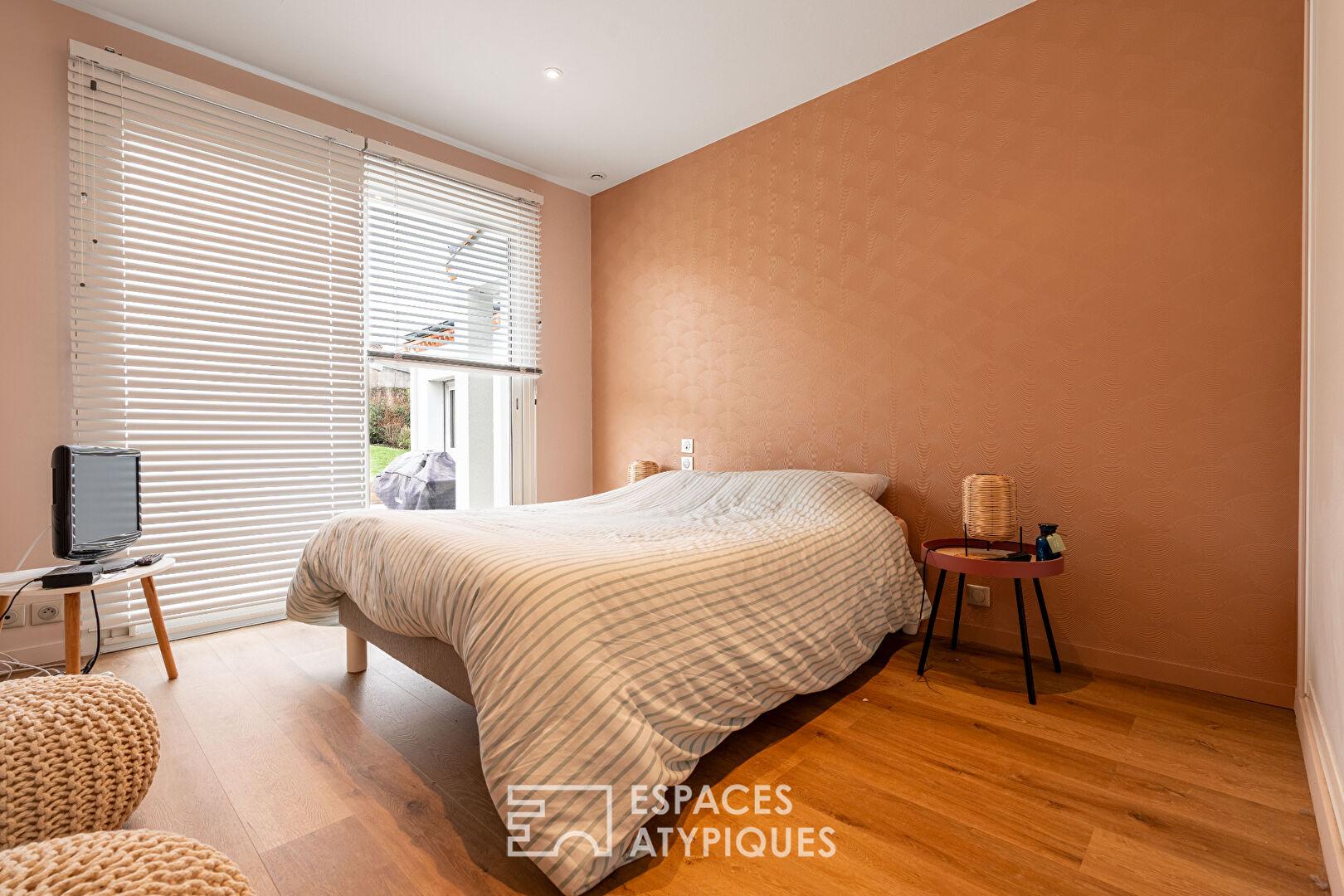 Au cœur du bourg de Gétigné, aux portes de Clisson, se dresse une maison d’architecte de 1982 déployant 217m² habitables. Cette demeure s’affranchit des conventions par un jeu subtil de niveaux et de matériaux nobles.