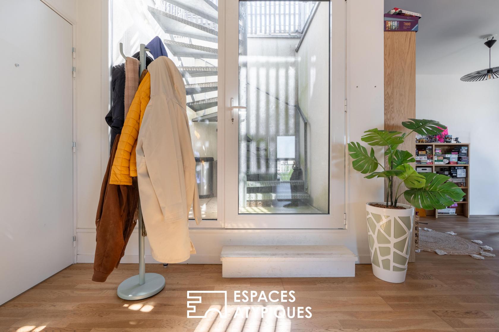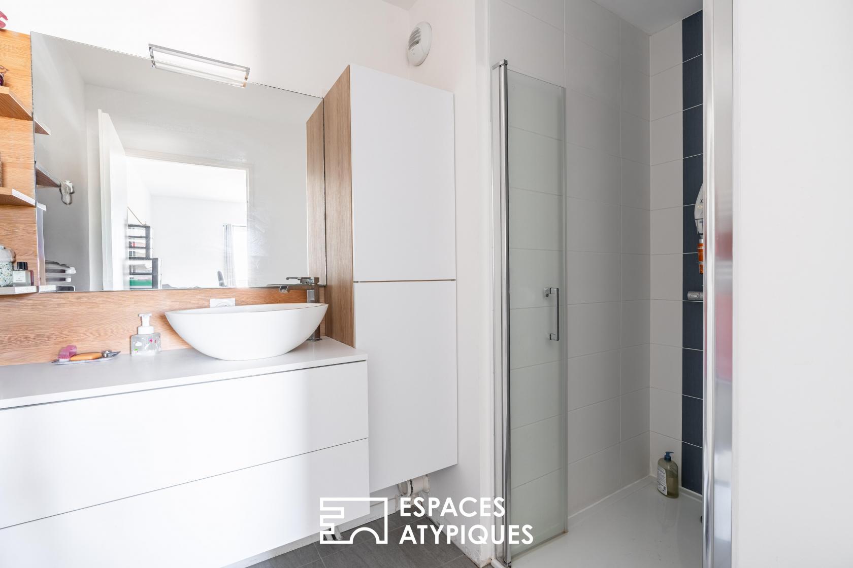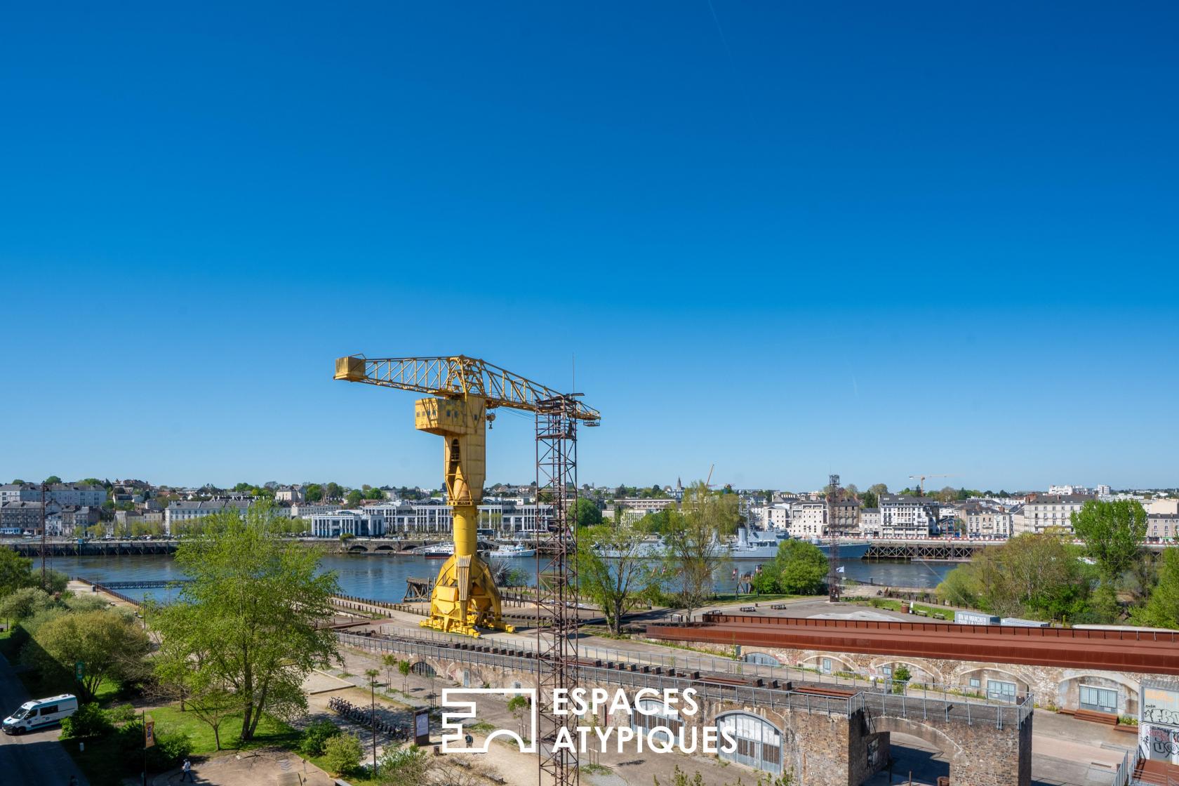 Le caractère unique de ce bien réside dans son accès privatif à un toit-terrasse solarium de 43 m², véritable oasis suspendue. Accessible par un escalier niché dans un patio intérieur faisant office de puits de lumière, cet extérieur offre une vue panoramique imprenable sur les horizons nantais et les anciens chantiers navals.