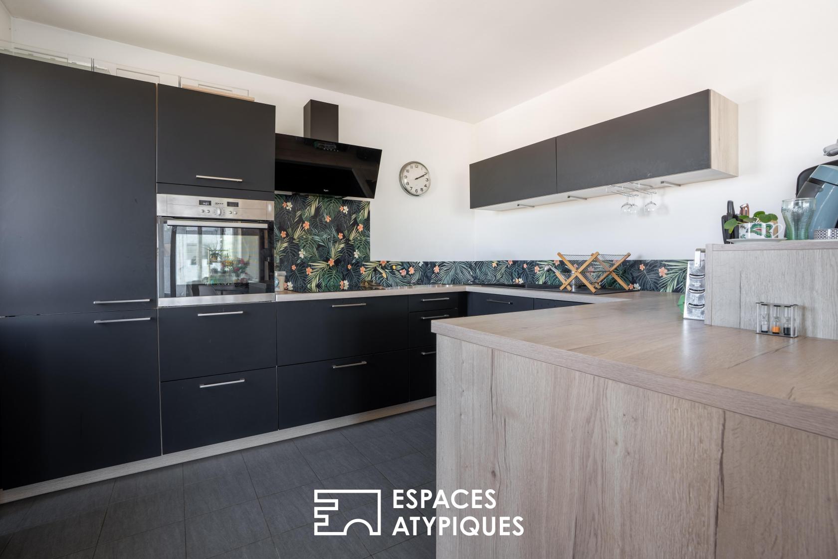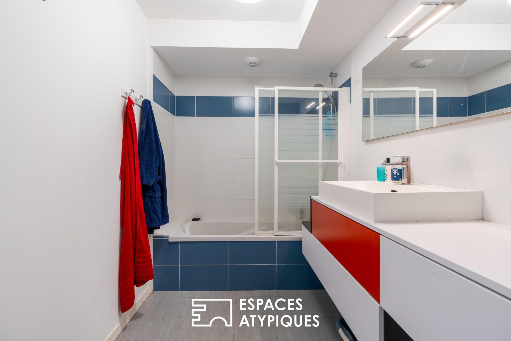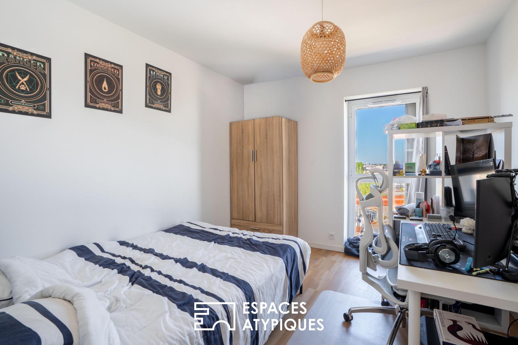 Le caractère unique de ce bien réside dans son accès privatif à un toit-terrasse solarium de 43 m², véritable oasis suspendue. Accessible par un escalier niché dans un patio intérieur faisant office de puits de lumière, cet extérieur offre une vue panoramique imprenable sur les horizons nantais et les anciens chantiers navals.
