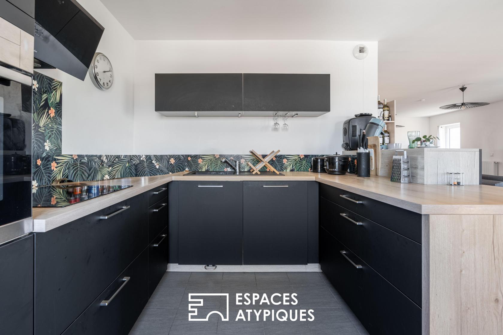 L’espace de vie principal constitue le point d’orgue de l’intérieur avec un volume généreux de 58 m² baigné de lumière naturelle. Ce séjour spacieux, intégrant une cuisine ouverte fonctionnelle, favorise une circulation fluide et une convivialité évidente. La partie nuit se compose actuellement de trois chambres confortables, complétées par une salle de bain, une salle d’eau avec WC, un cellier et un dégagement optimisé. La distribution des pièces a été pensée pour allier confort quotidien et modularité des espaces.