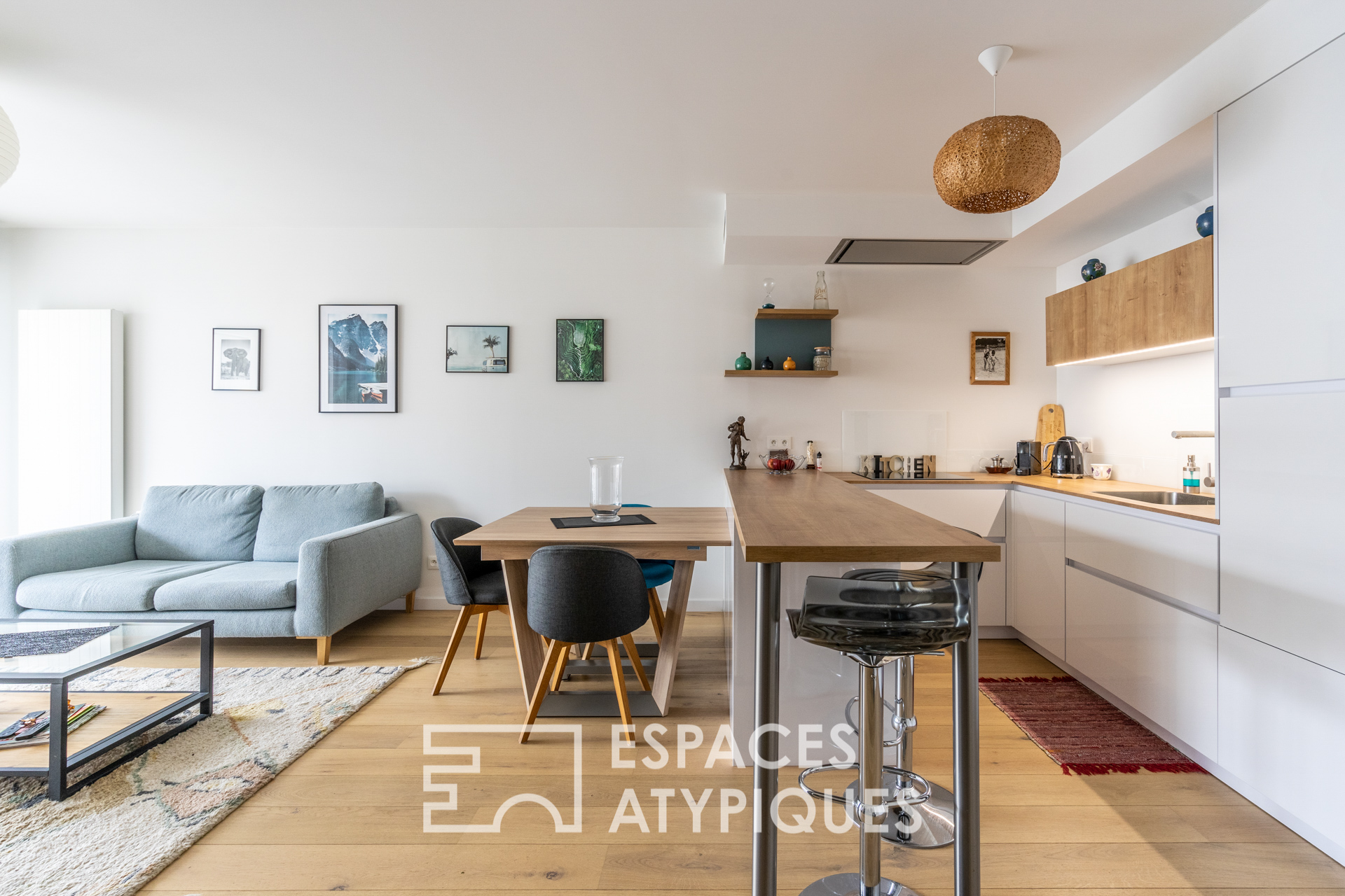 La pièce principale se compose d’une entrée avec dressing, d’un spacieux espace salon / salle à manger et cuisine entièrement ouvert, baigné de lumière et prolongé par la terrasse. Le choix des matériaux apporte beaucoup de clarté et d’élégance à cette pièce de vie. On retrouve en prolongement, l’espace nuit composé de trois chambres, dont une suite parentale avec salle d’eau et dressing. Cette partie est complétée par des toilettes indépendants et une salle de bain.