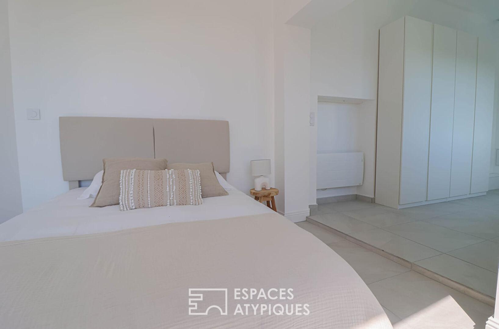 Le niveau inférieur accueille une seconde chambre, également dotée de sa salle d’eau, idéale pour recevoir ou créer un espace indépendant.