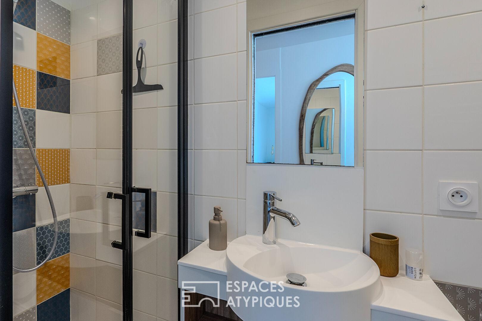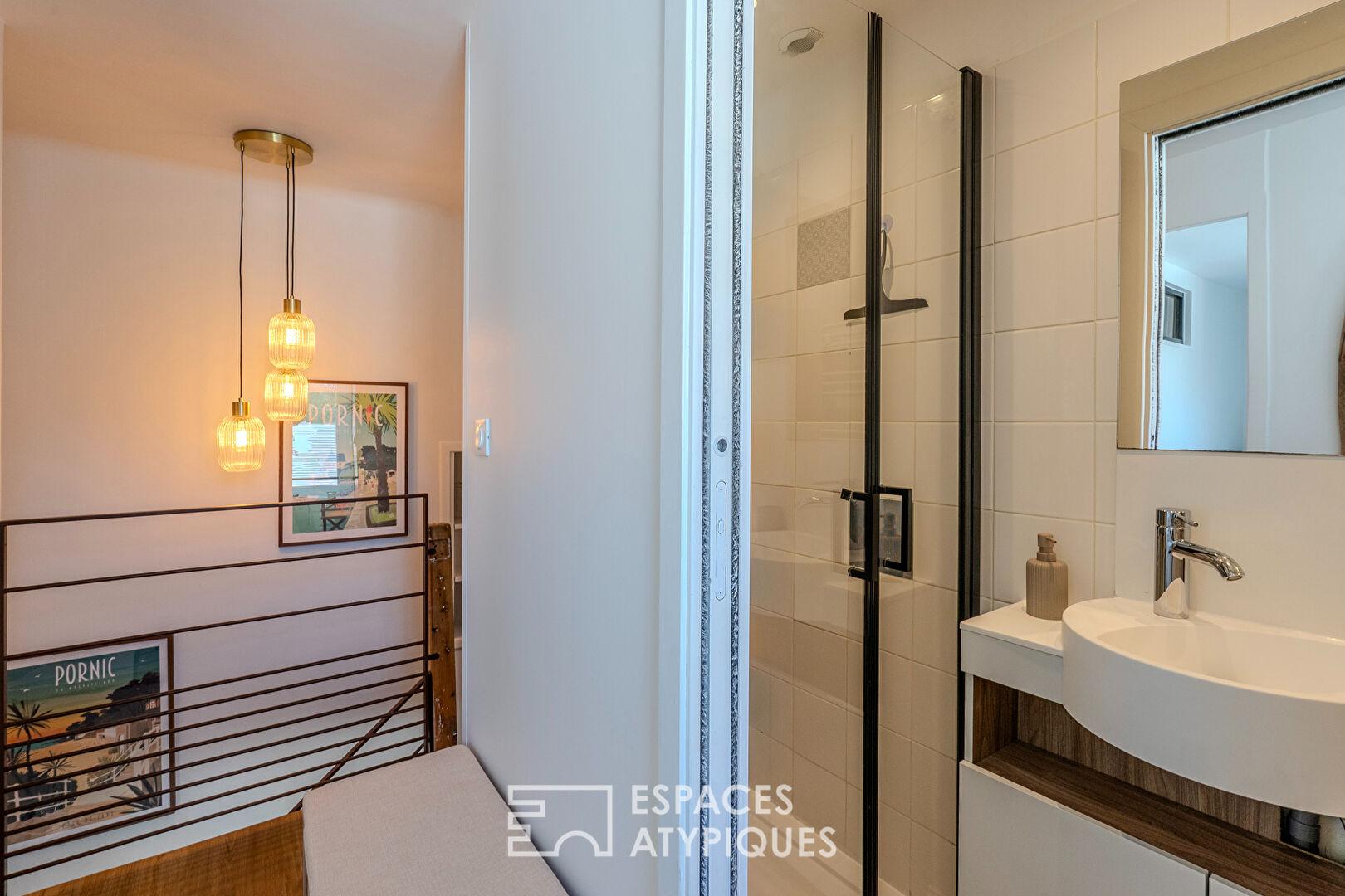 À l’étage, l’espace nuit propose une chambre ainsi qu’un coin nuit supplémentaire avec lit double, idéal pour accueillir famille ou amis. Une salle d’eau avec toilettes complète ce niveau avec sobriété et modernité.
