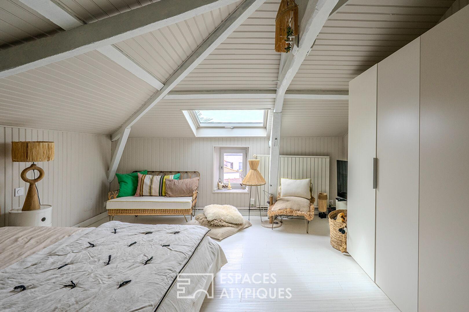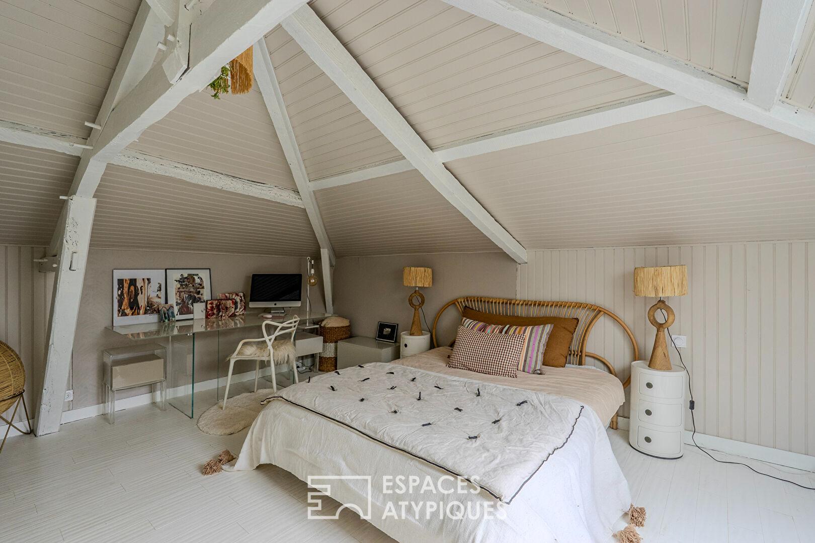 À l’étage, deux belles chambres avec rangements offrent calme et confort, accompagnées d’une salle de bain élégante et d’un espace bureau idéal pour le télétravail ou un coin lecture.