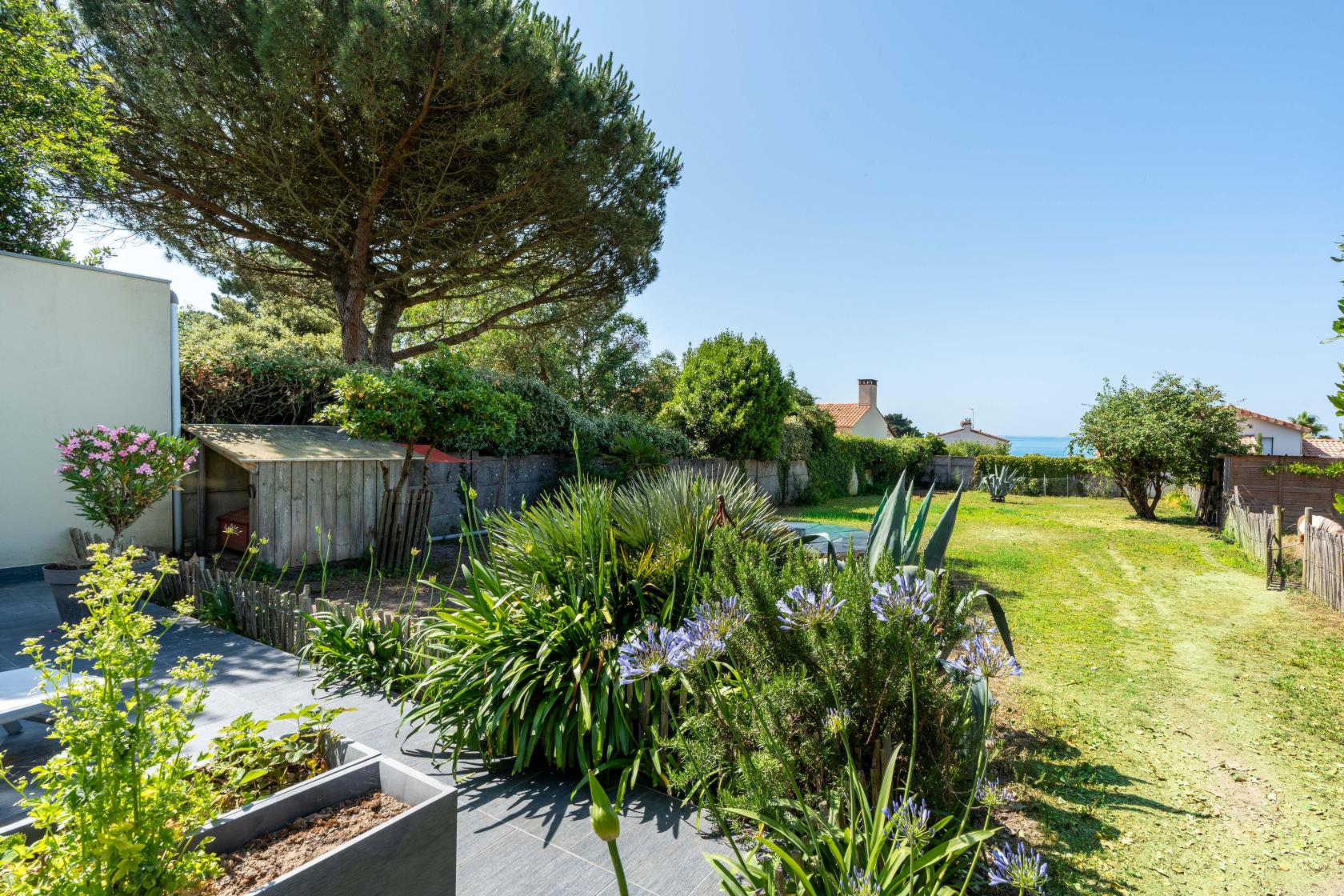Édifiée sur un terrain arboré d’environ 700 m², la propriété offre un cadre de vie rare, à la fois paisible et inspirant.