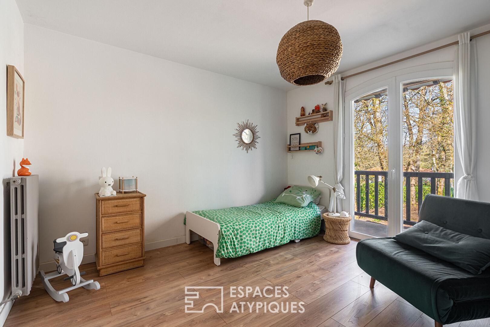 Le terrain arboré, l’allée remarquable et l’environnement boisé classé confèrent une intimité rare. Les commerces et les écoles sont accessibles en 5 minutes, avec un bus à l’entrée du hameau.