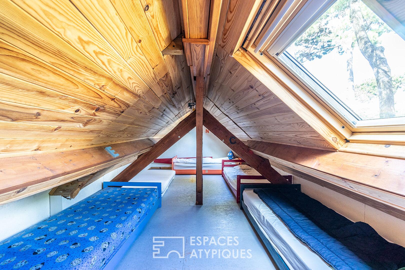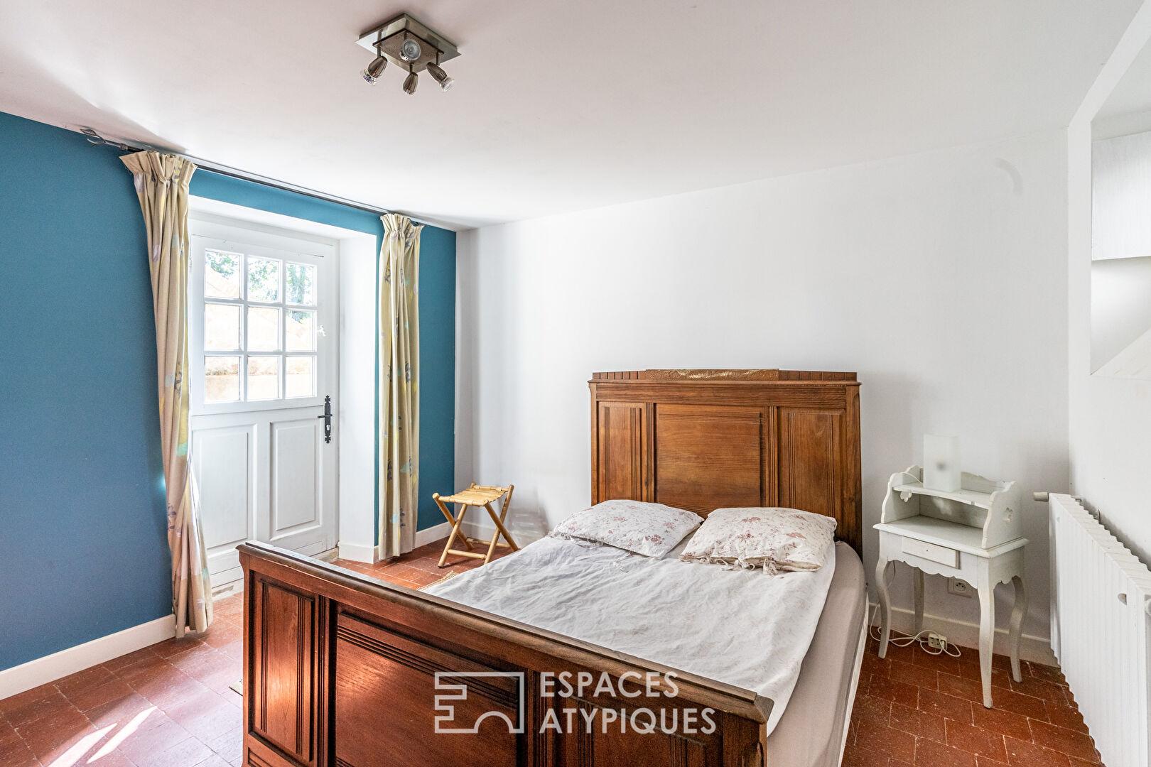 À l’étage, accessible par un escalier en bois rénové, l’espace nuit dévoile une chambre lumineuse avec vue sur le jardin, ainsi qu’un dortoir, propice aux séjours en famille ou entre amis.