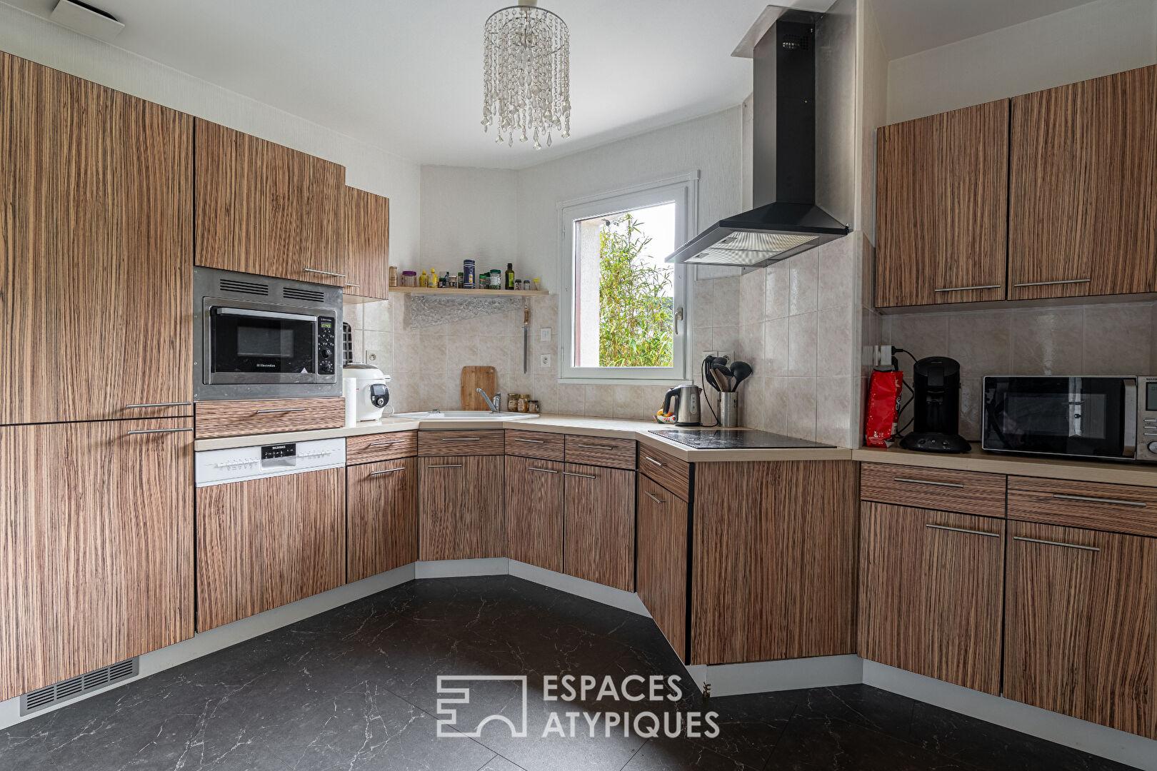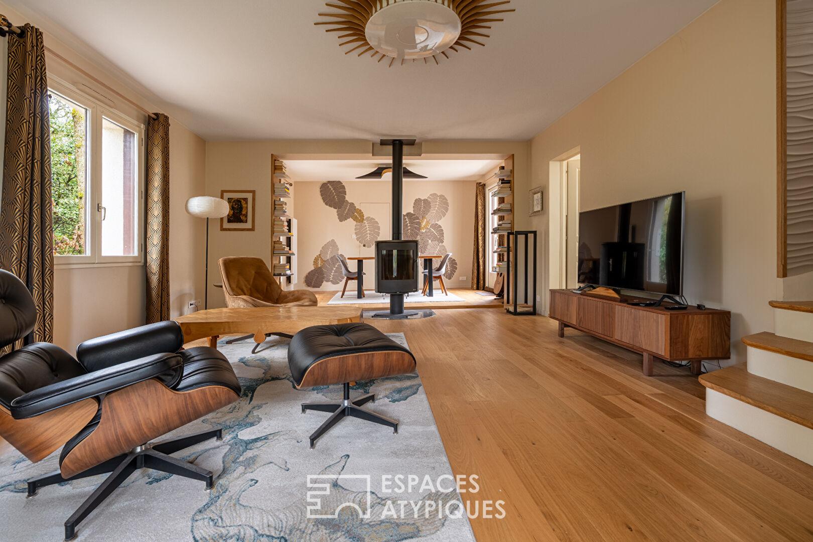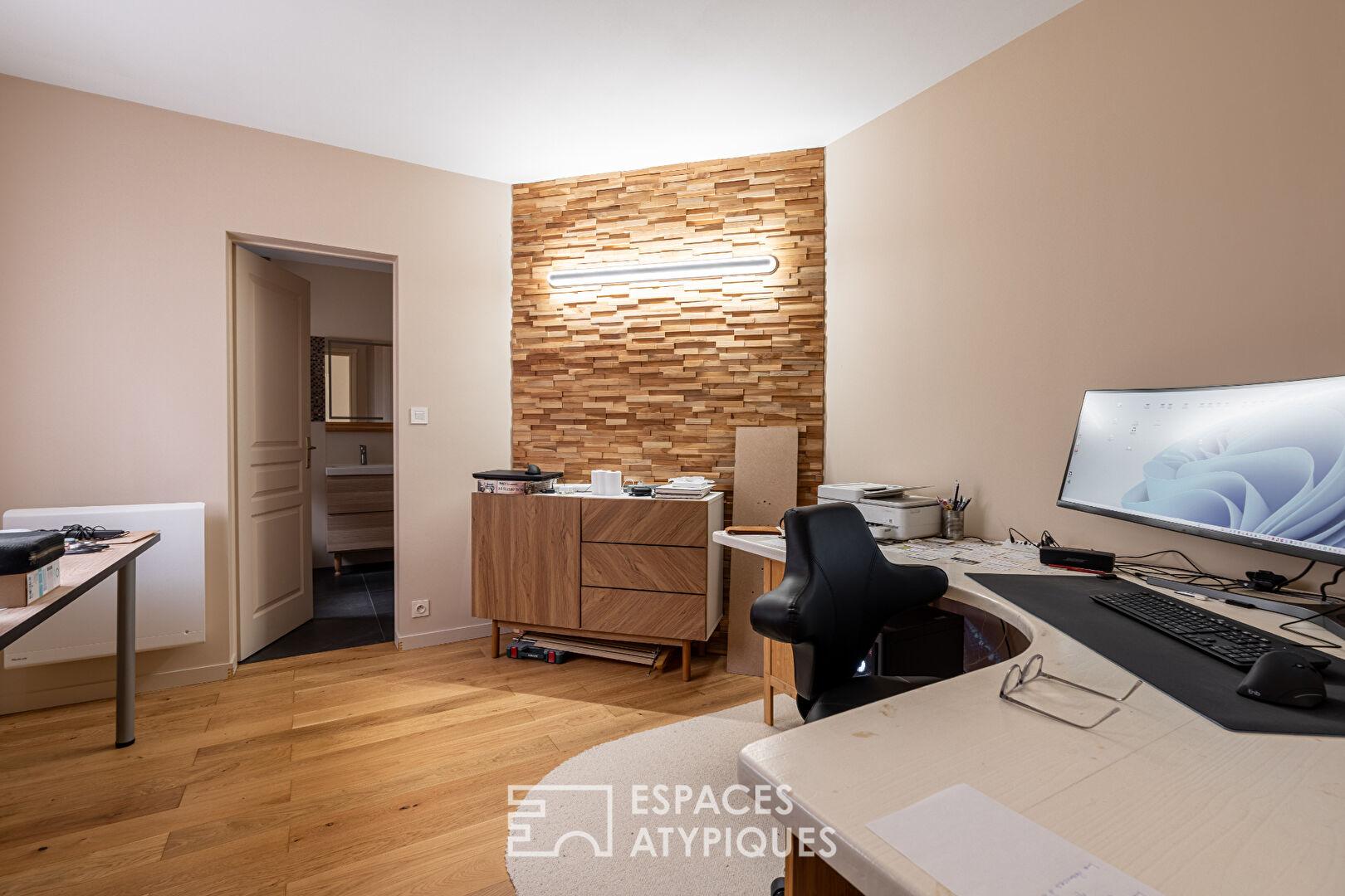 L’entrée avec dressing s’ouvre sur un vaste salon-séjour chaleureux, sublimé par un parquet en chêne et un poêle pivotant à 360°, véritable pièce maîtresse de l’espace de vie. La cuisine aménagée et équipée profite d’un accès direct à une première terrasse, prolongeant naturellement les volumes vers l’extérieur. Le rez-de-chaussée accueille également une chambre, aujourd’hui aménagée en bureau, avec salle de bain attenante, ainsi qu’un second espace indépendant comprenant un bureau, une salle d’eau et une chambre, idéal pour une activité libérale ou pour recevoir en toute autonomie. Une buanderie et un WC complètent ce niveau.
