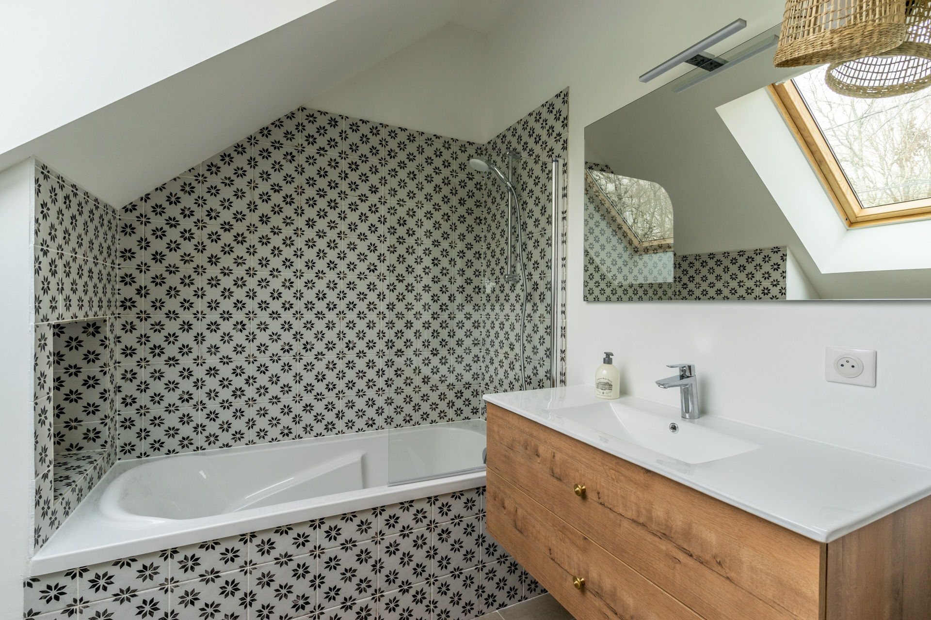Le rez-de-chaussée se compose d’un bel espace salon, salle à manger et cuisine entièrement ouverte et équipée, traversant et lumineux grâce au choix des matériaux. Les poutres apparentes, la cheminée d’époque et la cuisine effet chêne clair apportent du cachet à cette pièce. Le plancher chauffant apporte un réel confort.
