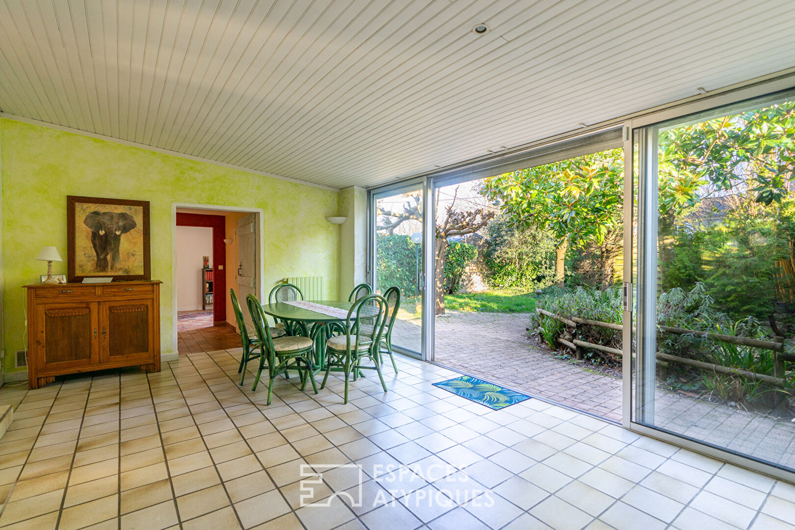 L’entrée offre d’un côté l’accès au salon, avec son imposante cheminée, de l’autre une perspective sur un second espace de vie de près de 30 m2 à réinterpréter avec un accès direct au jardin.