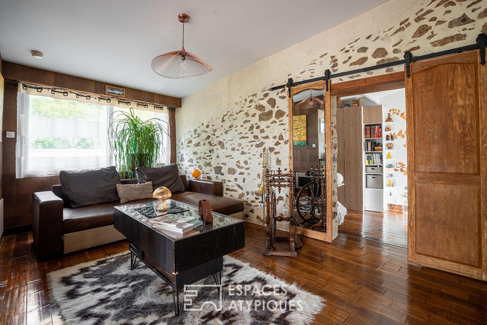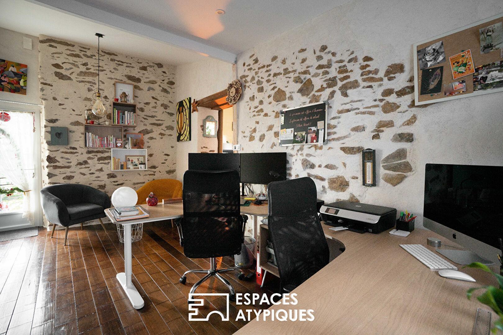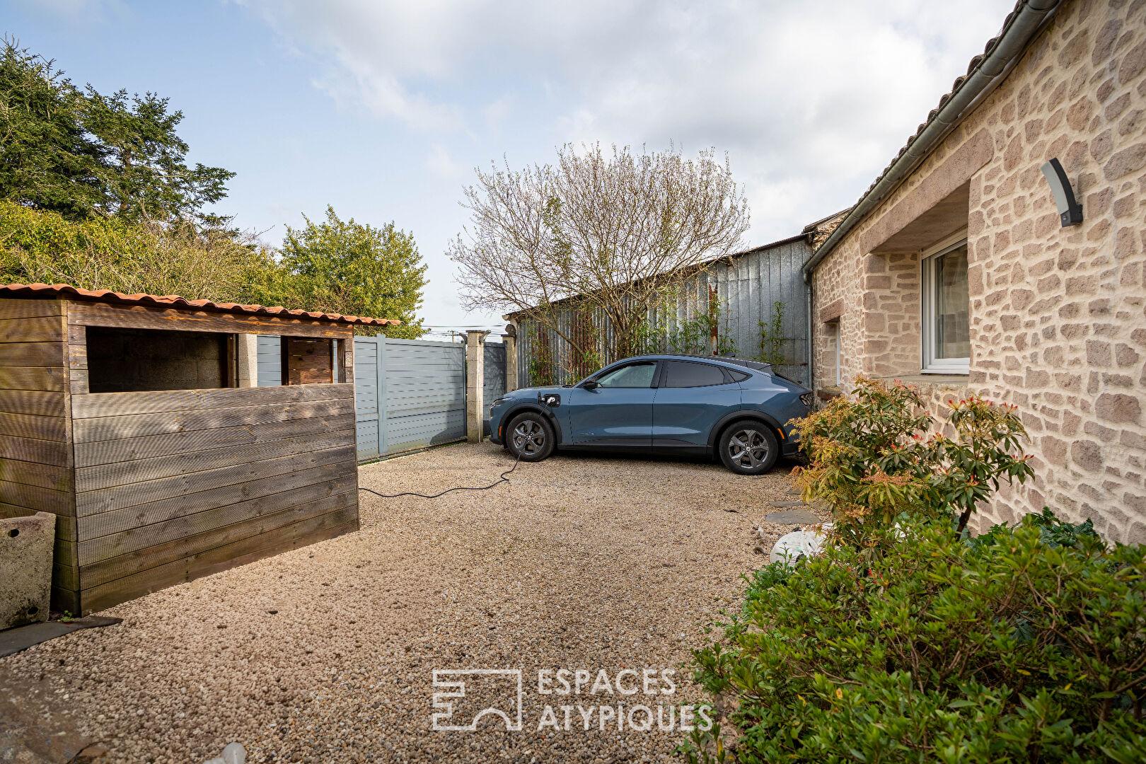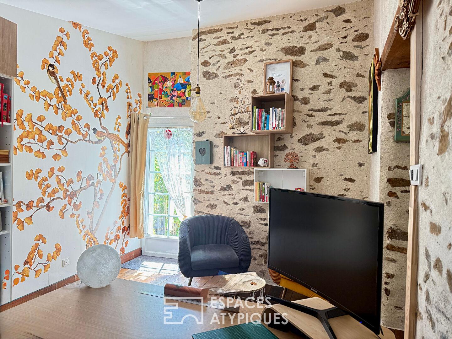 À la campagne de Saint-Philbert-de-Grand-Lieu, à seulement cinq minutes du bourg, cette propriété du XIXe siècle s’intègre au sein d’un ancien corps de ferme. Rénovée avec soin, la maison prend place à l’angle d’une maison de maître divisée en deux lots. Sa configuration en L s’accompagne d’une mitoyenneté discrète avec une autre dépendance du domaine.