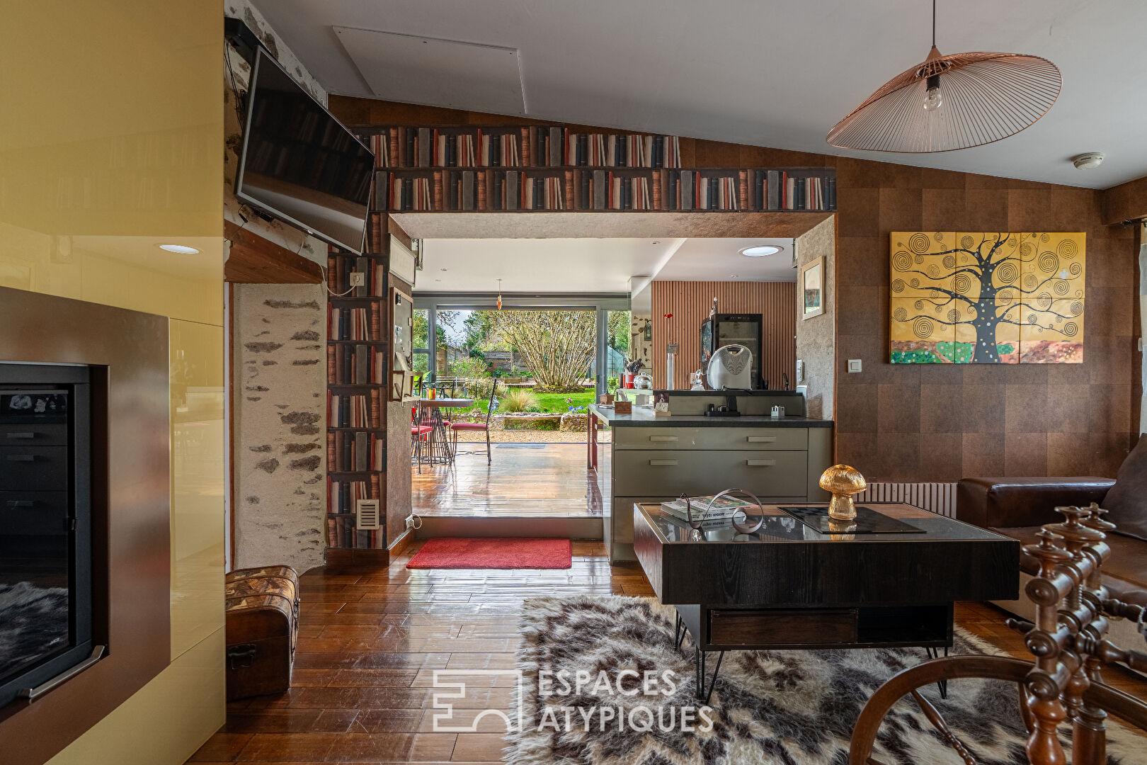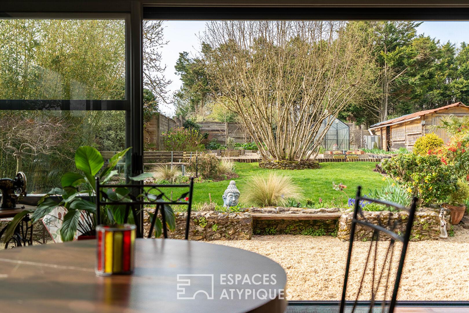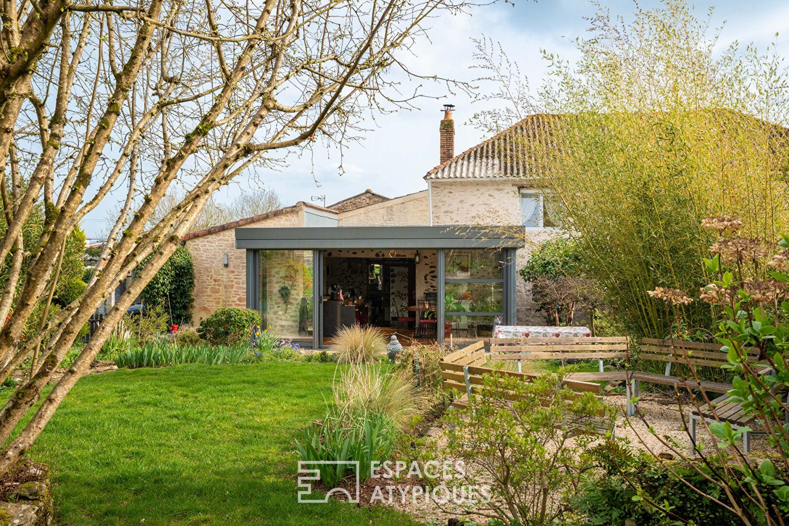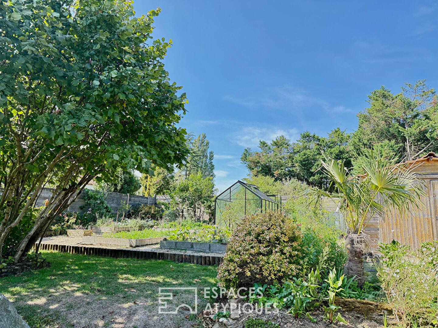 À la campagne de Saint-Philbert-de-Grand-Lieu, à seulement cinq minutes du bourg, cette propriété du XIXe siècle s’intègre au sein d’un ancien corps de ferme. Rénovée avec soin, la maison prend place à l’angle d’une maison de maître divisée en deux lots. Sa configuration en L s’accompagne d’une mitoyenneté discrète avec une autre dépendance du domaine.