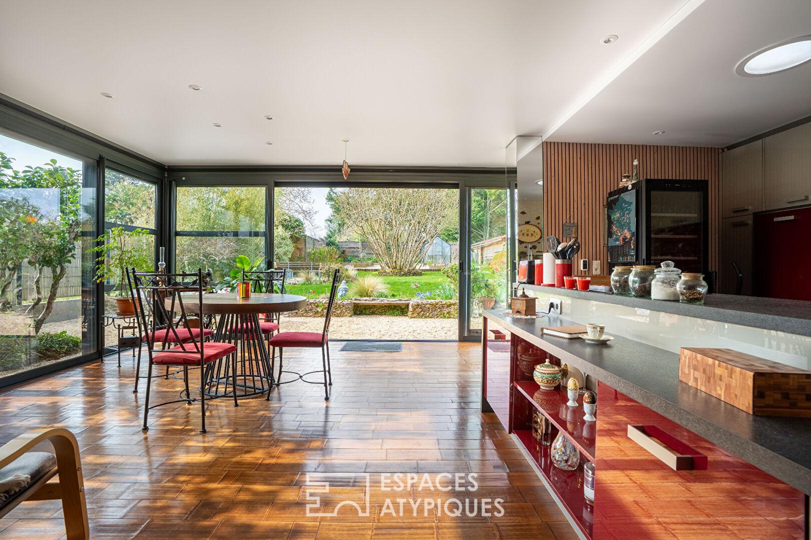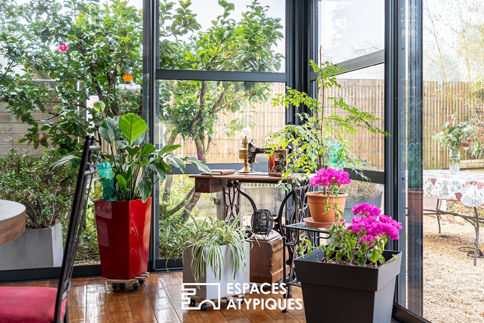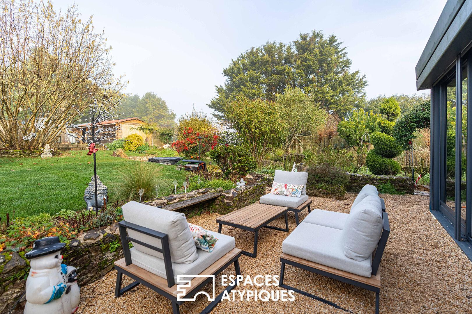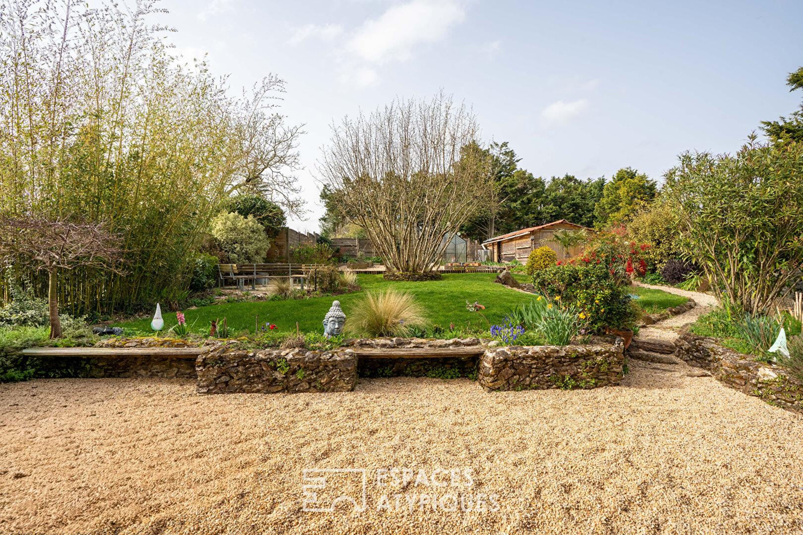 À la campagne de Saint-Philbert-de-Grand-Lieu, à seulement cinq minutes du bourg, cette propriété du XIXe siècle s’intègre au sein d’un ancien corps de ferme. Rénovée avec soin, la maison prend place à l’angle d’une maison de maître divisée en deux lots. Sa configuration en L s’accompagne d’une mitoyenneté discrète avec une autre dépendance du domaine.